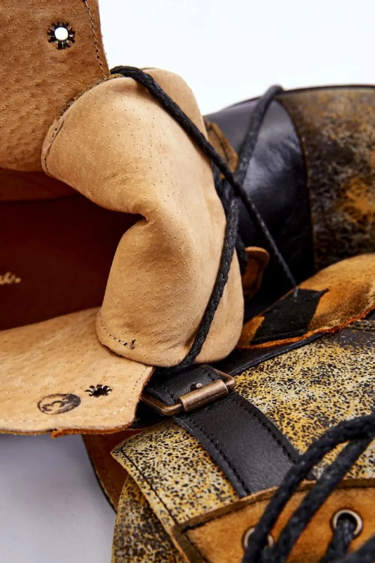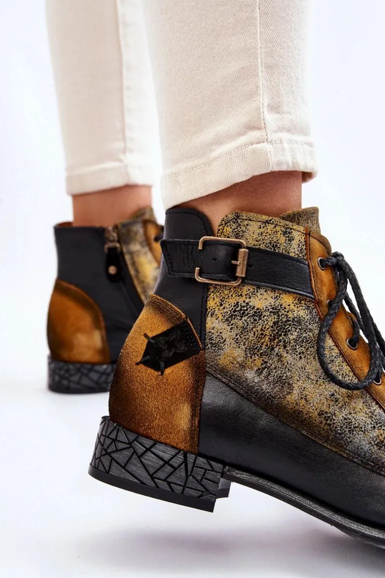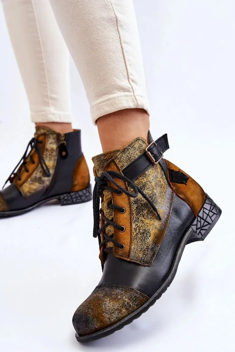 Damskie trzewiki zostały wykonane z naturalnych skór wysokiej jakości. Model ten posiada solidne sznurowanie oraz suwak z boku cholewki. Botki zostały ozdobione paskiem z klamrą. Trzewiki osadzono na płaskim obcasie. Botki nie posiadają ocieplenia. Dodatkowo zapiętek jest usztywniany. Koniecznie powinnaś je mieć! Przy wyborze rozmiaru prosimy sugerować się tabelą rozmiarów.