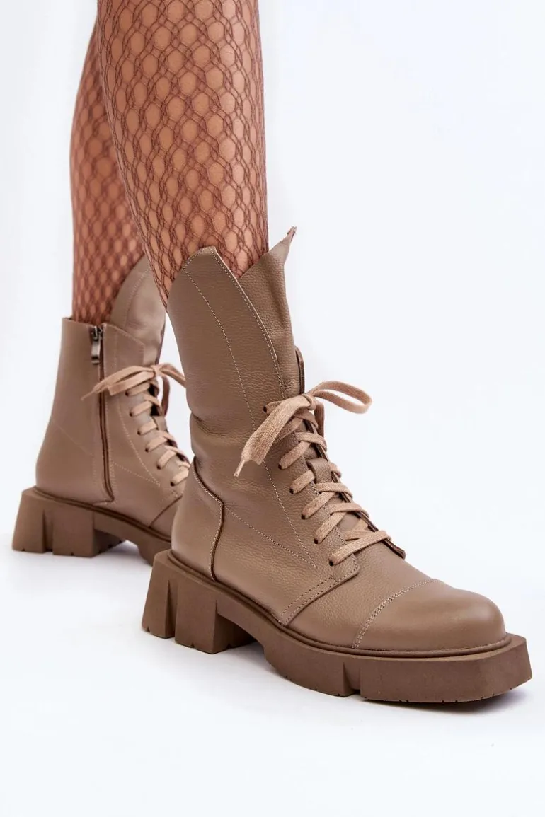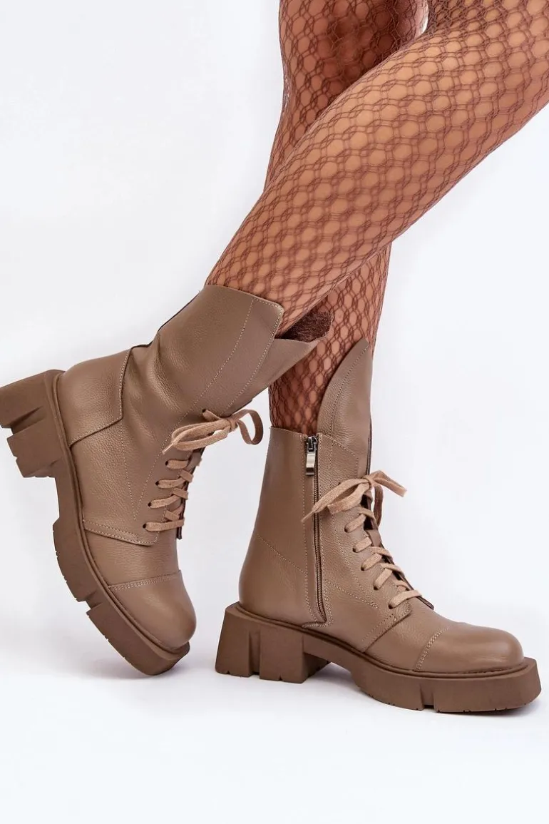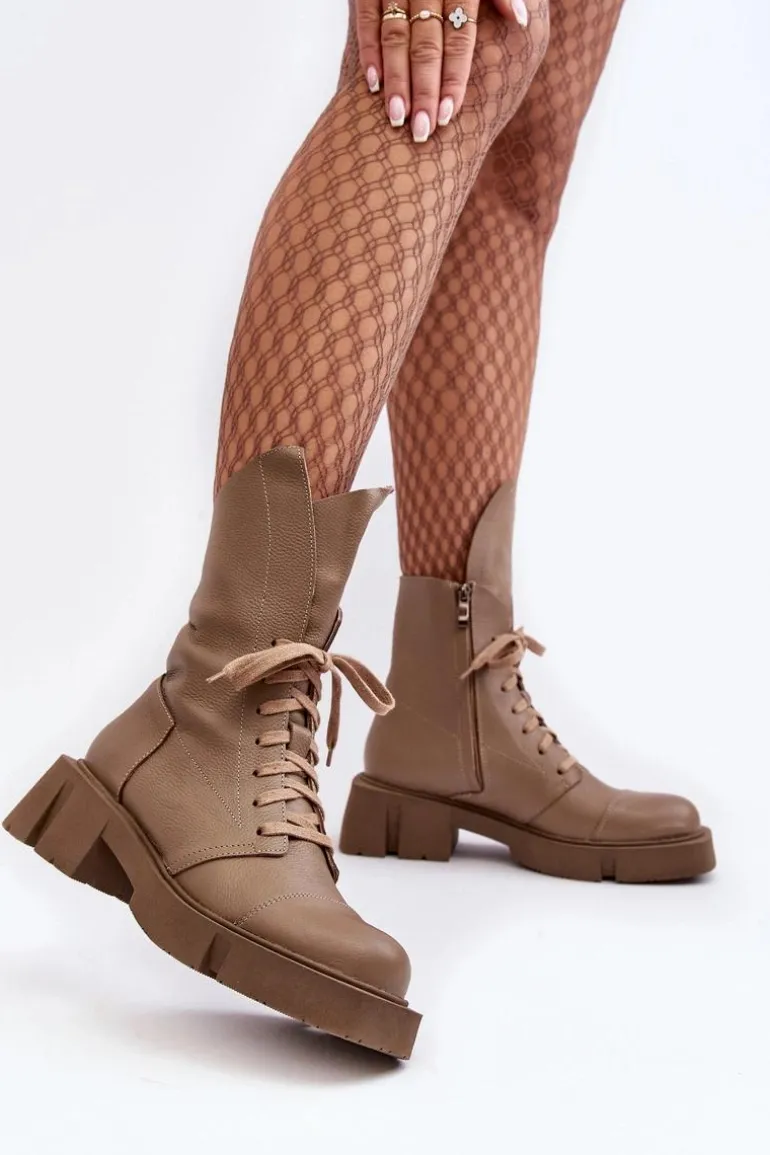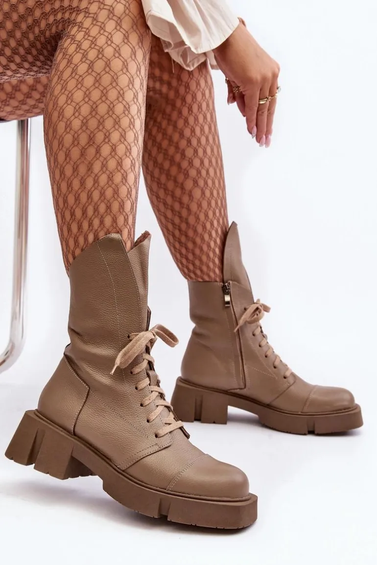 Botki damskie wykonane ze skóry naturalnej. Osadzona na masywnym, płaskim obcasie oraz platformie. Zapinane na suwak. Z przodu sznurowanie. Zapiętek jest usztywniony. Miękka wkładka zapewni komfort podczas użytkowania. Noski zaokrąglone. Ten modny model będzie pasować do wielu jesienno-zimowych stylizacji! Przy wyborze rozmiaru prosimy sugerować się tabelą rozmiarów.