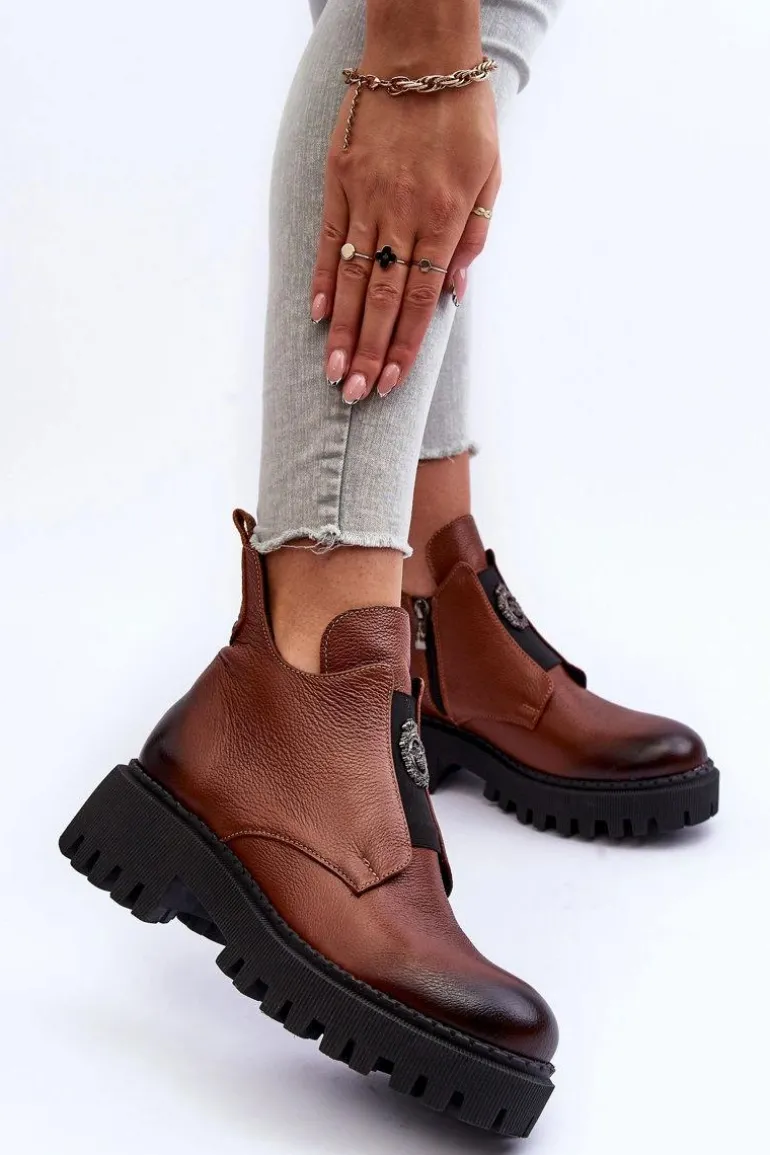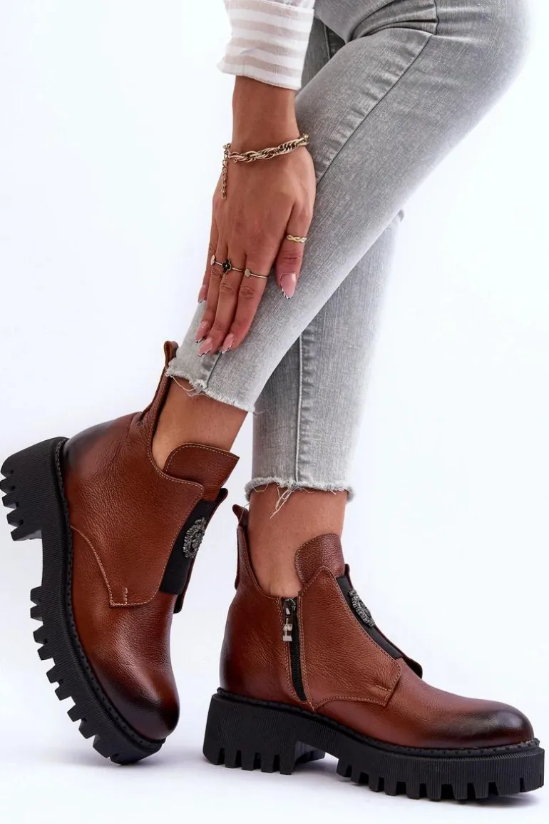 Damskie botki zostały wykonane z wysokiej jakości naturalnej skóry. Osadzone na masywnym obcasie i platformie ze żłobieniami. Model zapinany na suwak po wewnętrznej stronie cholewki. Z przodu na elastycznej wstawce znajduje się ozdoba z tworzywa sztucznego. Wnętrze ocieplone kocem obuwniczym. Ten wyjątkowy model wzbogaci wiele Twoich stylizacji! Przy wyborze rozmiaru prosimy sugerować się tabelą rozmiarów.