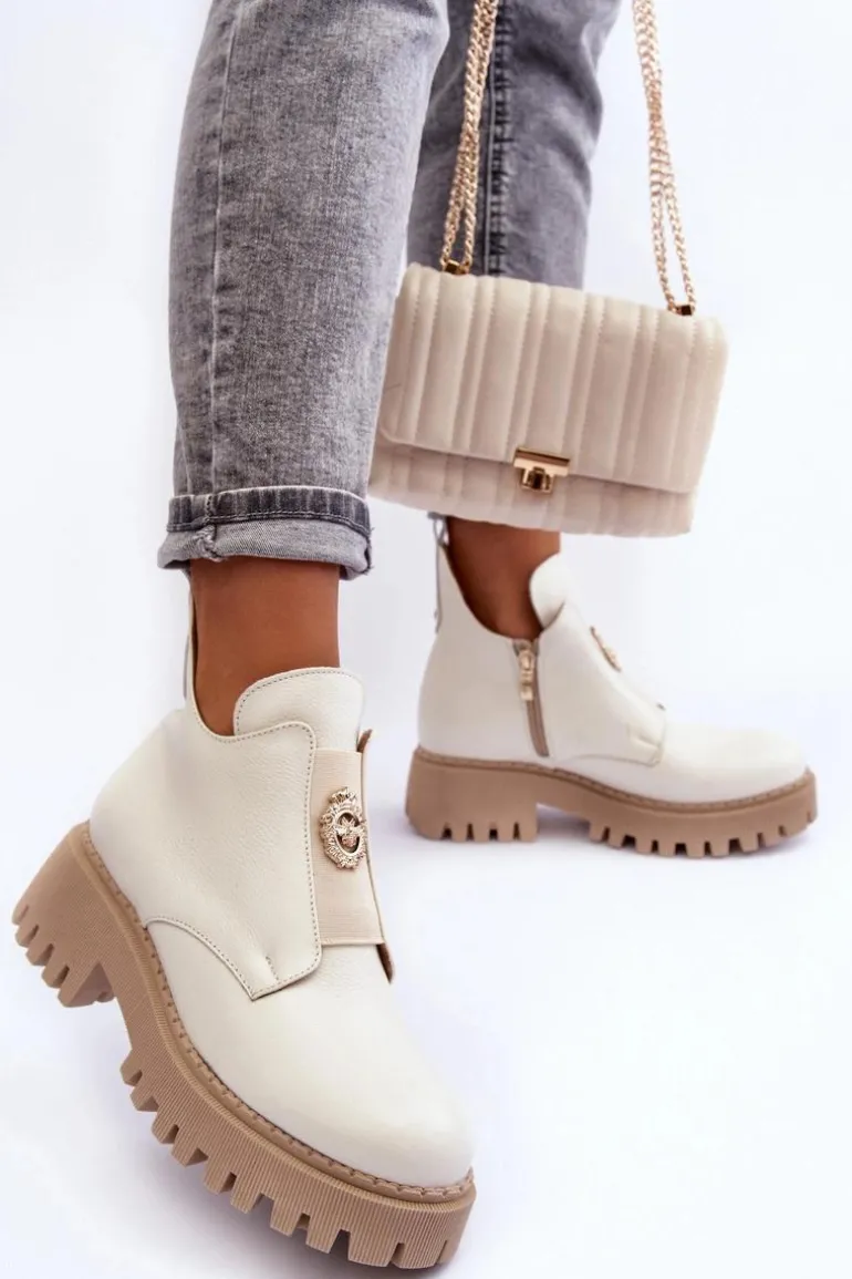 Damskie Skórzane Botki Z Ozdobą Jasnobeżowe Lemar Lusanna