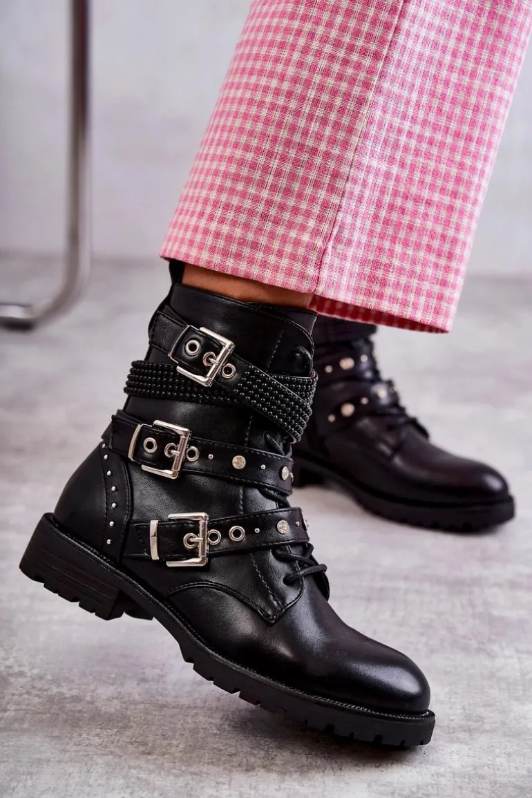 Modne damskie botki zostały wykonane z wierzchu z eko skóry. Na cholewce znajdują się paski z ozdobami w postaci ćwieków. Dodatkowo są one regulowane i posiadają klamry. Model ten jest zapinany na zamek błyskawiczny oraz sznurowany. Wnętrze botków jest pokryte miękkim kocem obuwniczym. Delikatna platforma oraz płaski obcas zapewnią stabilność na każdym kroku. Przy wyborze rozmiaru prosimy sugerować się tabelą rozmiarów.