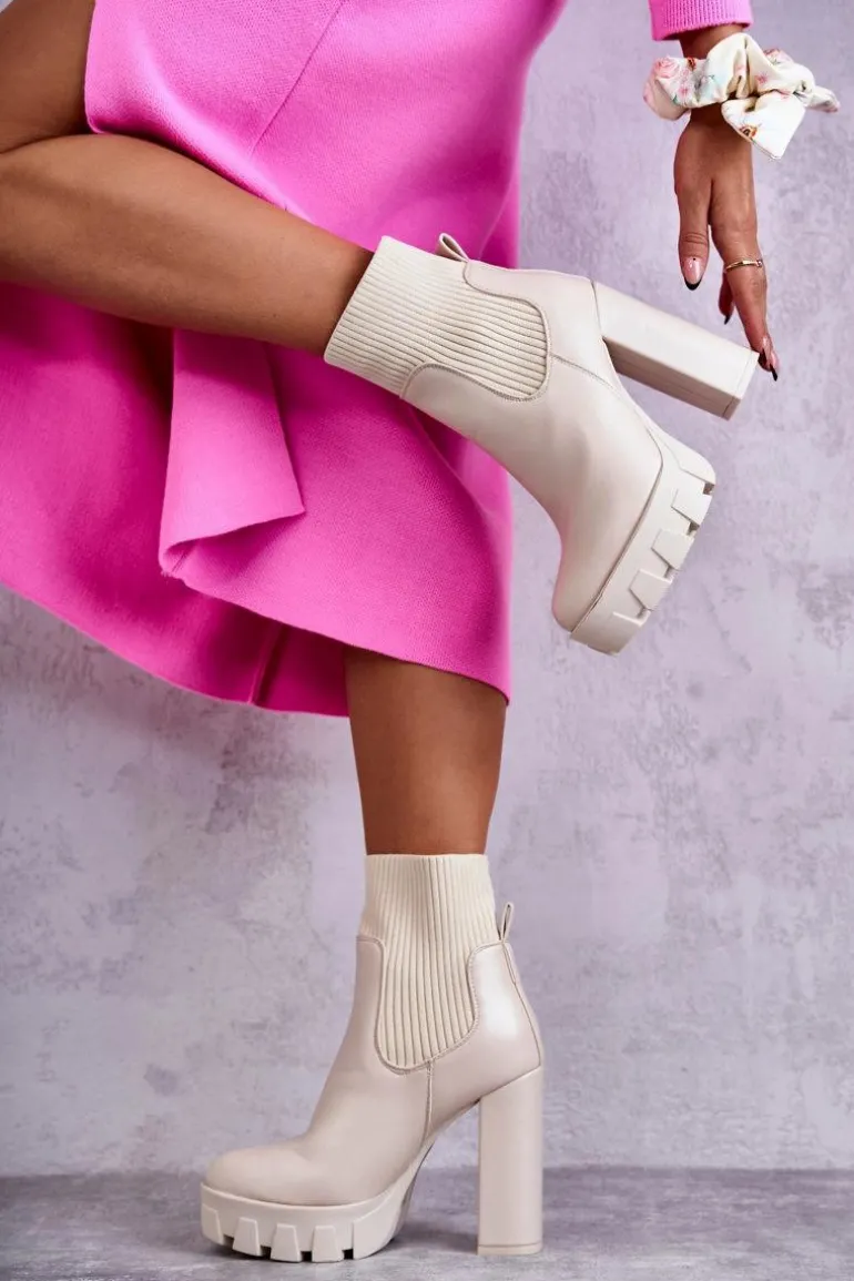 Niezwykłe botki damskie w modnej odsłonie! Posiadają elastyczną cholewkę w formie skarpety połączoną z eko skórą. Osadzone na masywnym obcasie w postaci słupka oraz platformie ze żłobieniami. Wygodny model z wkładką z eko skóry i usztywnianym zapiętkiem, który pozwoli na odpowiednią stabilizację stopy. Ten model powinien być właśnie Twój! Przy wyborze rozmiaru prosimy sugerować się tabelą rozmiarów.