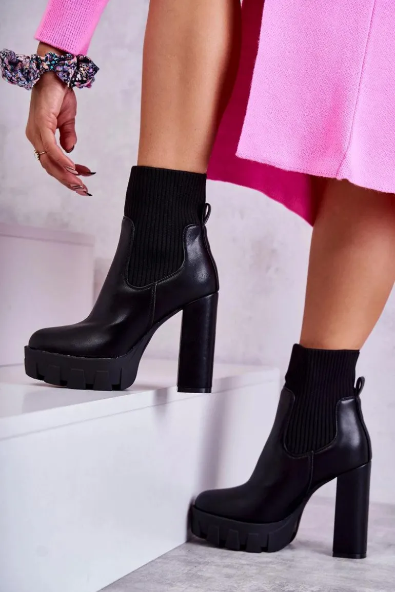 Niezwykłe botki damskie w modnej odsłonie! Posiadają elastyczną cholewkę w formie skarpety połączoną z eko skórą. Osadzone na masywnym obcasie w postaci słupka oraz platformie ze żłobieniami. Wygodny model z wkładką z eko skóry i usztywnianym zapiętkiem, który pozwoli na odpowiednią stabilizację stopy. Ten model powinien być właśnie Twój! Przy wyborze rozmiaru prosimy sugerować się tabelą rozmiarów.