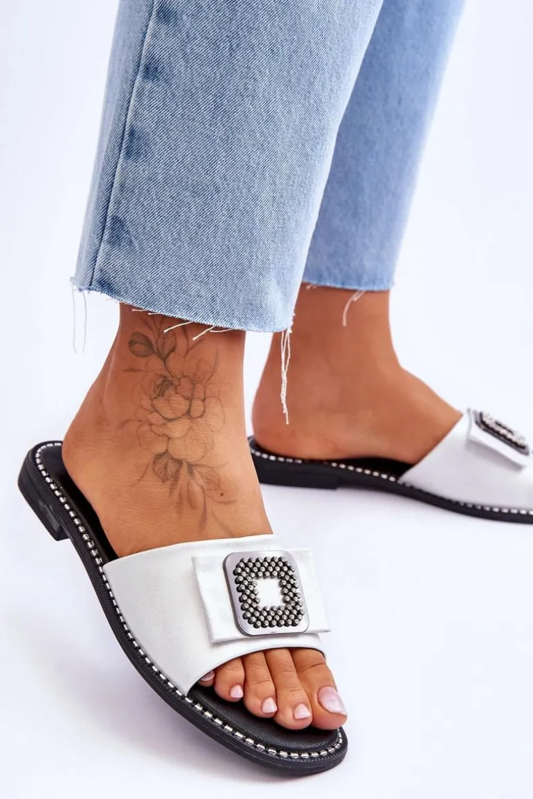 Klasyczne klapki świetnie sprawdzą się w sezonie letnim! Są wygodne, dzięki wkładce Comfort wykonanej z eko skóry. Model ten został wykonany z eko skóry. Posiada na pasku kwadratową ozdobę wykonaną z tworzywa z dżetami. Klapki osadzono na płaskim obcasie. Koniecznie powinnaś je mieć! Przy wyborze rozmiaru prosimy sugerować się tabelą rozmiarów.