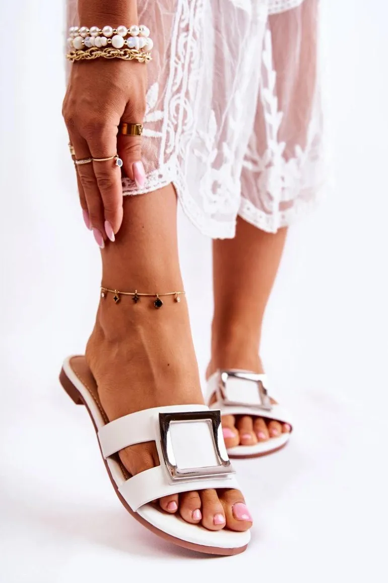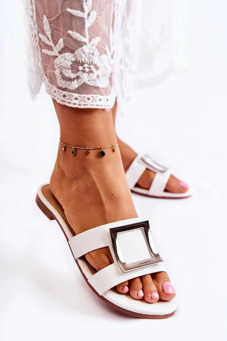 Damskie Skórzane Klapki Z Ozdobą Białe Roysa