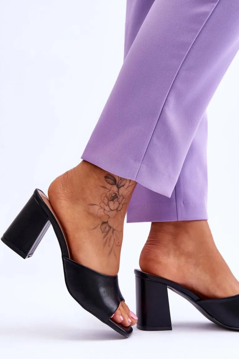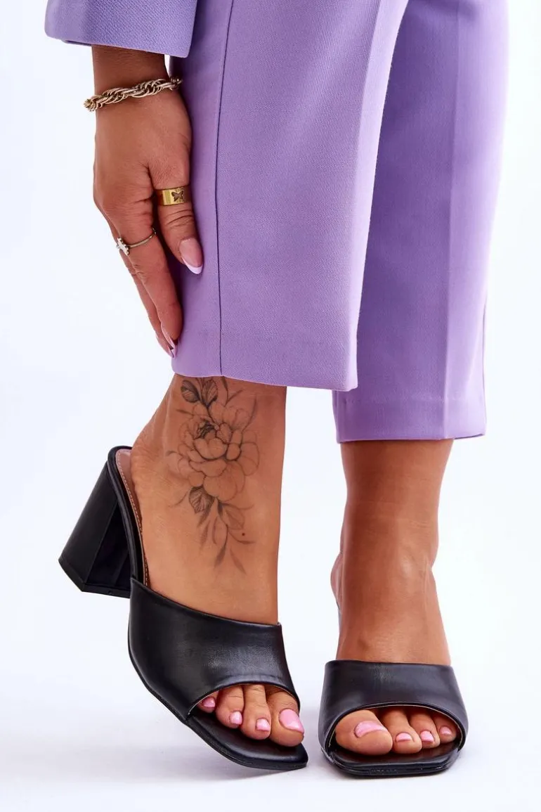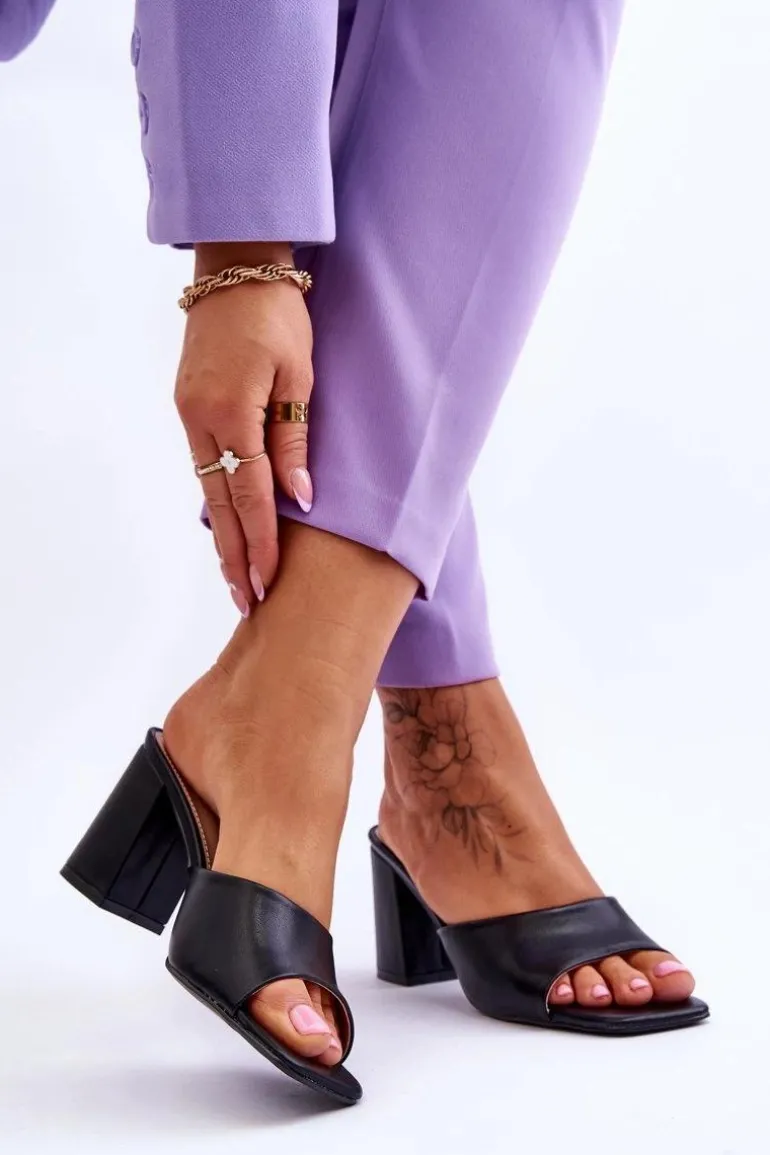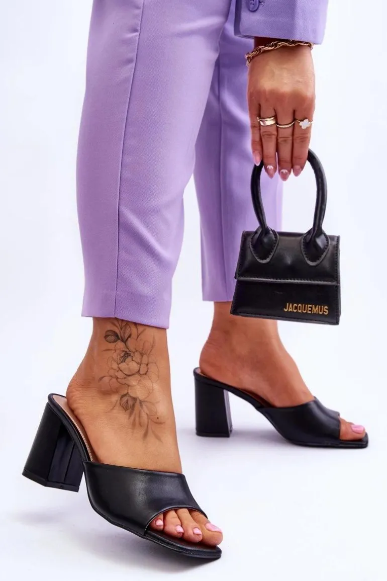 Damskie klapki o klasycznym fasonie. Model ten został wykonany z eko skóry. Klapki posiadają otwarty, kwadratowy nosek. Wkładka jest wygodna i wykonana z eko skóry. Klapki osadzono na obcasie w postaci słupka. Idealne do wielu stylizacji w upalne dni! Przy wyborze rozmiaru prosimy sugerować się tabelą rozmiarów.