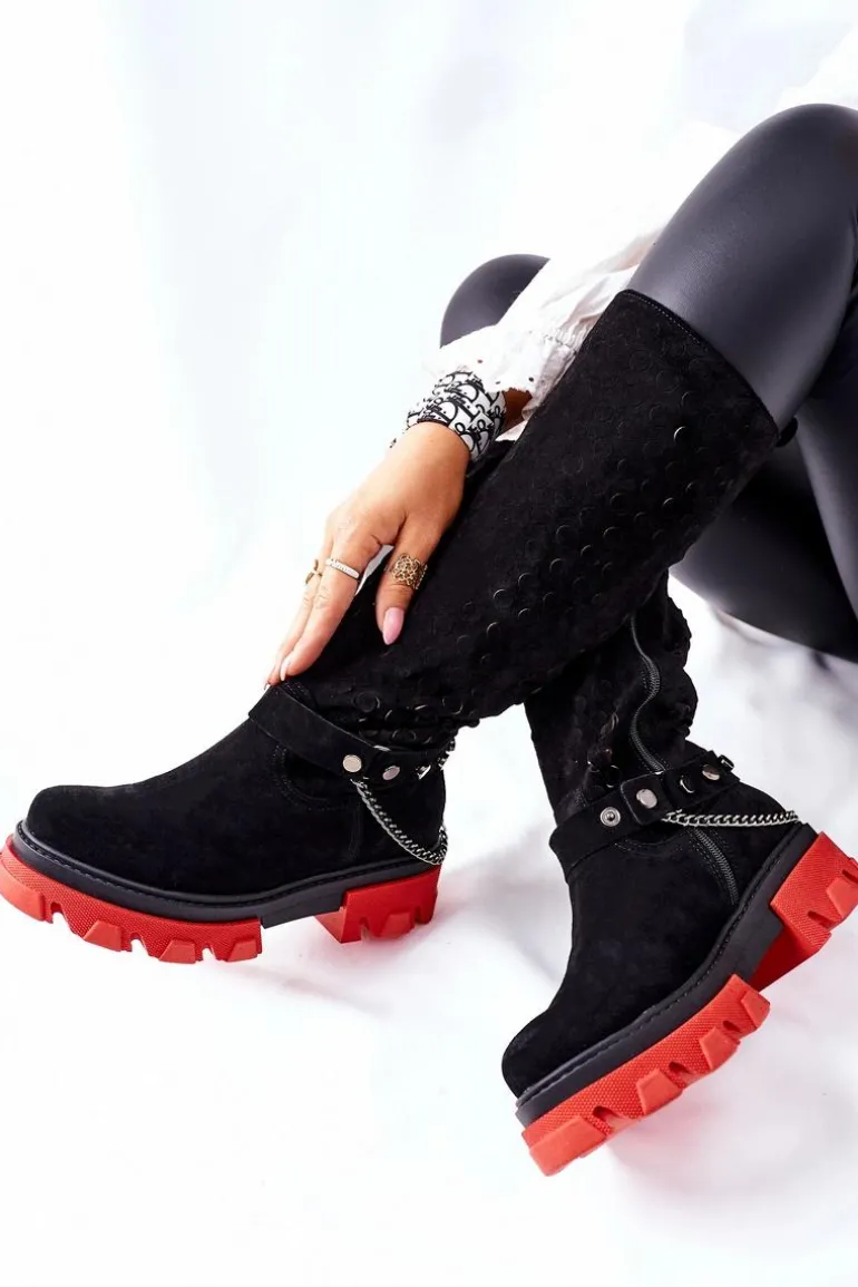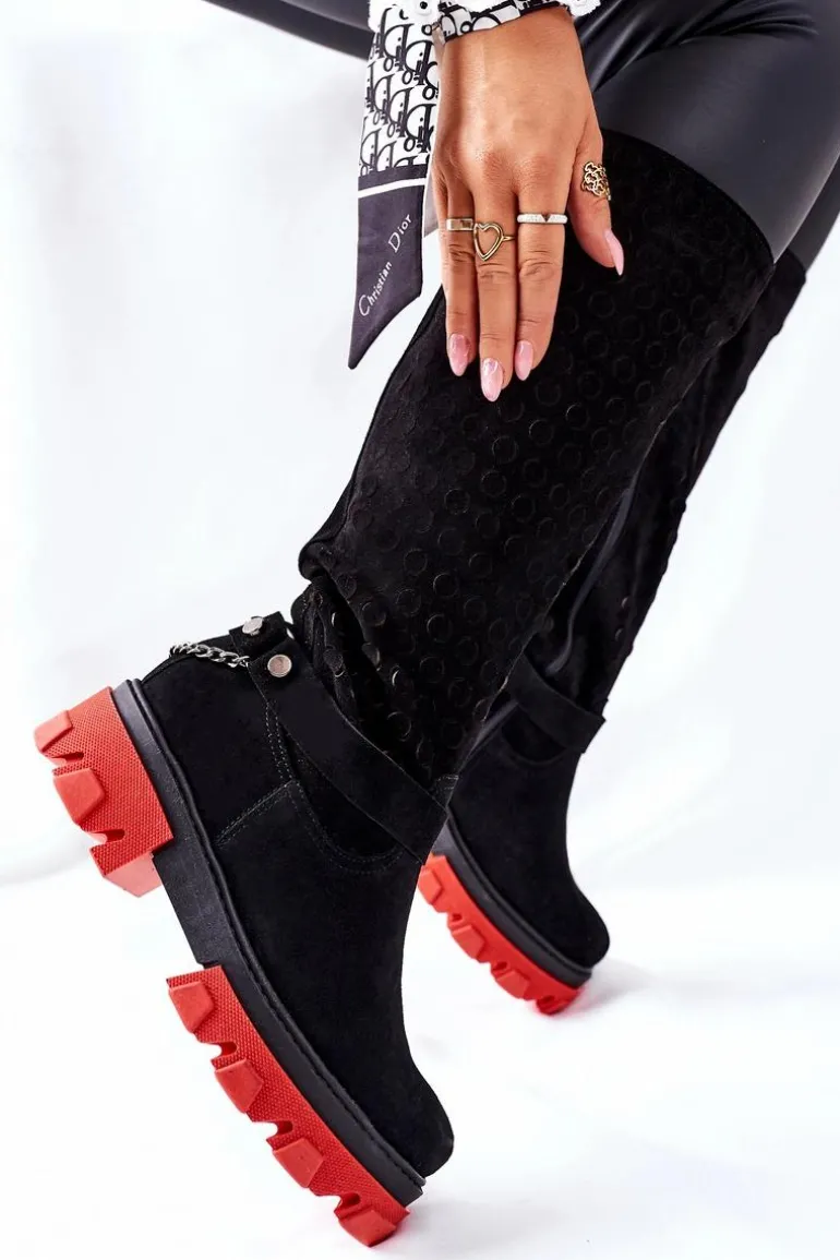 Niesamowite kozaki, które koniecznie muszą znaleźć się w szafie kobiety tak wyjątkowej jak Ty! Gruba platformowa podeszwa, zdobienia z łańcucha oraz pasek z nitami to podkreśla ich niesamowity, mocny charakter! Możliwość odpięcia zdobienia. Buty w całości wykonane z naturalnego zamszu. Zakładanie ułatwi wszyty na boku suwak. Przy wyborze rozmiaru, prosimy sugerować się tabelą rozmiarów.