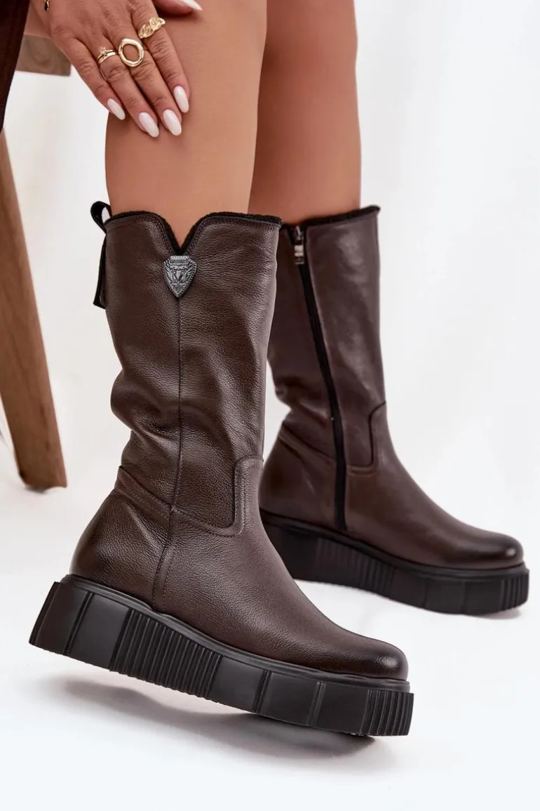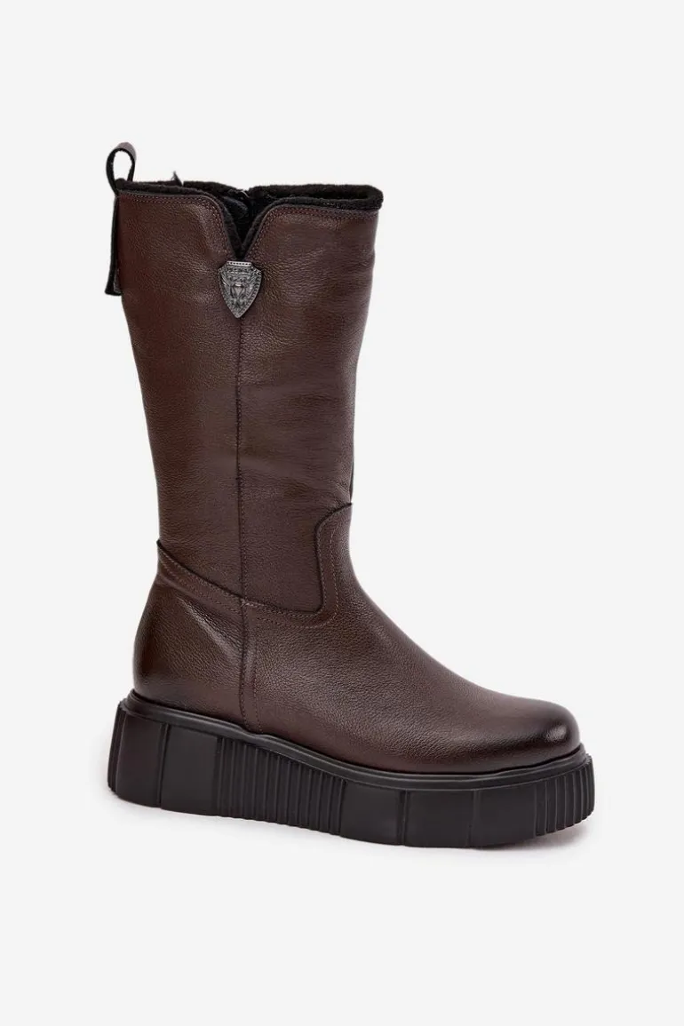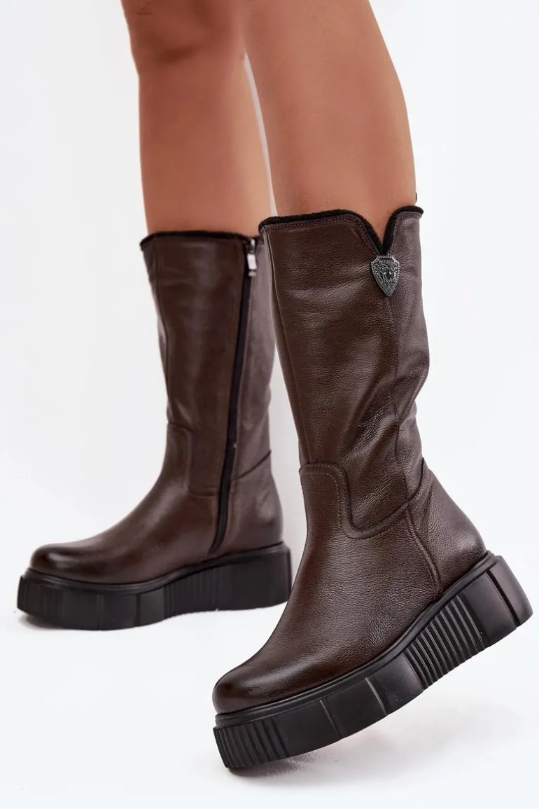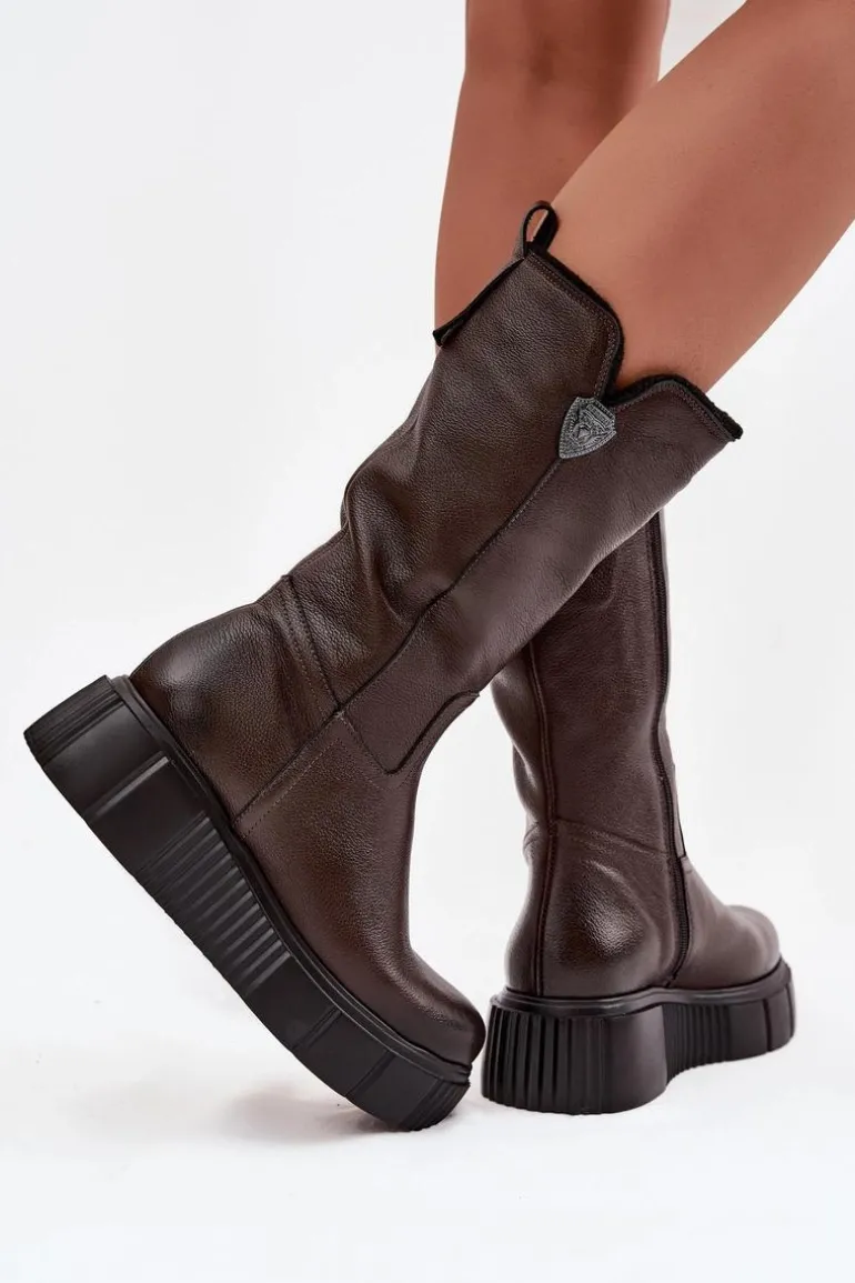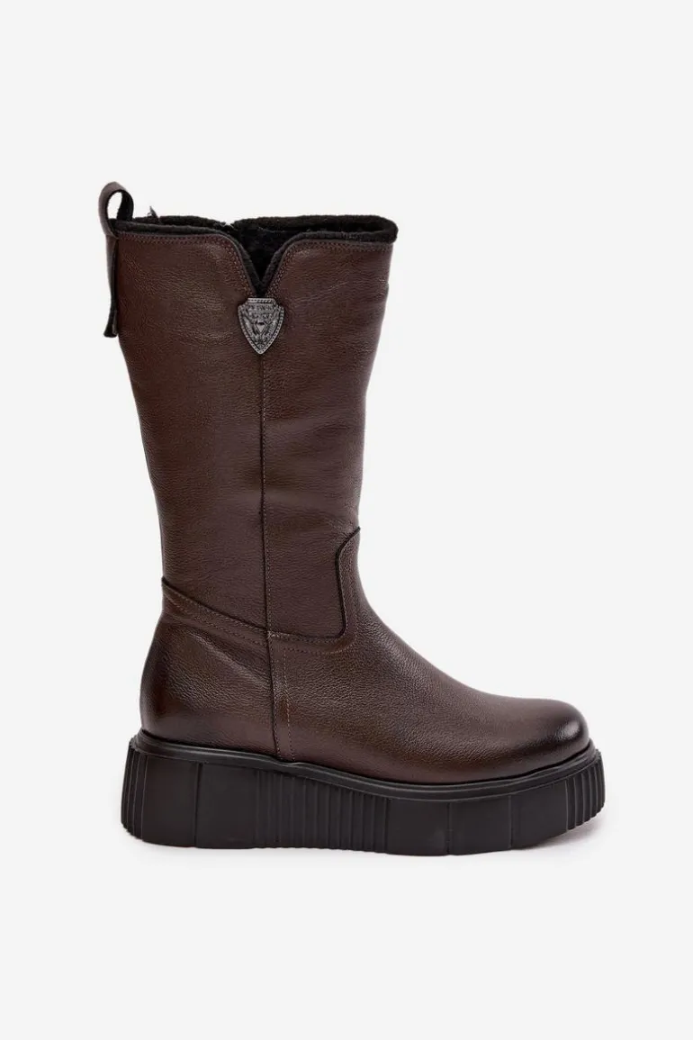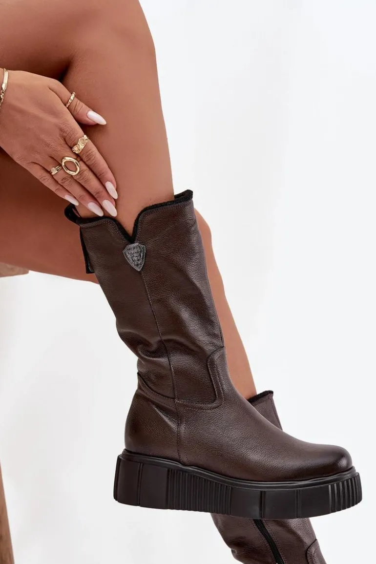 Damskie kozaki zostały wykonane z naturalnej skóry. Model ten posiada suwak z boku cholewki. Wnętrze zostało ocieplone naturalną wełną. Zapiętek jest usztywniany. Kozaki osadzono na masywnej platformie oraz koturnie. Posiadają ozdobny element z boku cholewki. Ten model świetnie sprawdzi się podczas chłodnych, zimowych dni. Przy wyborze rozmiaru prosimy sugerować się tabelą rozmiarów.