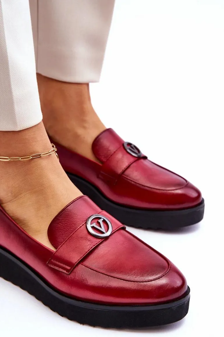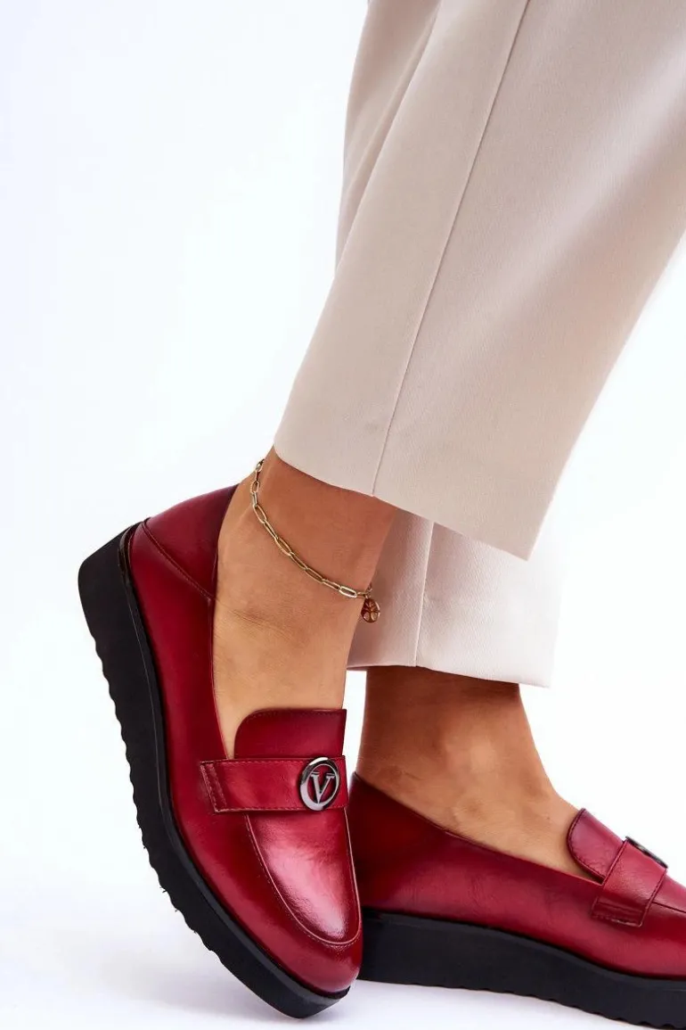 Damskie mokasyny zostały wykonane z wysokiej jakości eko skóry. Posiadają z przodu pasek z ozdobą w kształcie koła i literą V. Mokasyny zostały osadzone na platformie z niskim koturnem. Miękka wkładka z naturalnej skóry zapewni wygodę podczas użytkowania. Przy wyborze rozmiaru prosimy sugerować się tabelą rozmiarów.