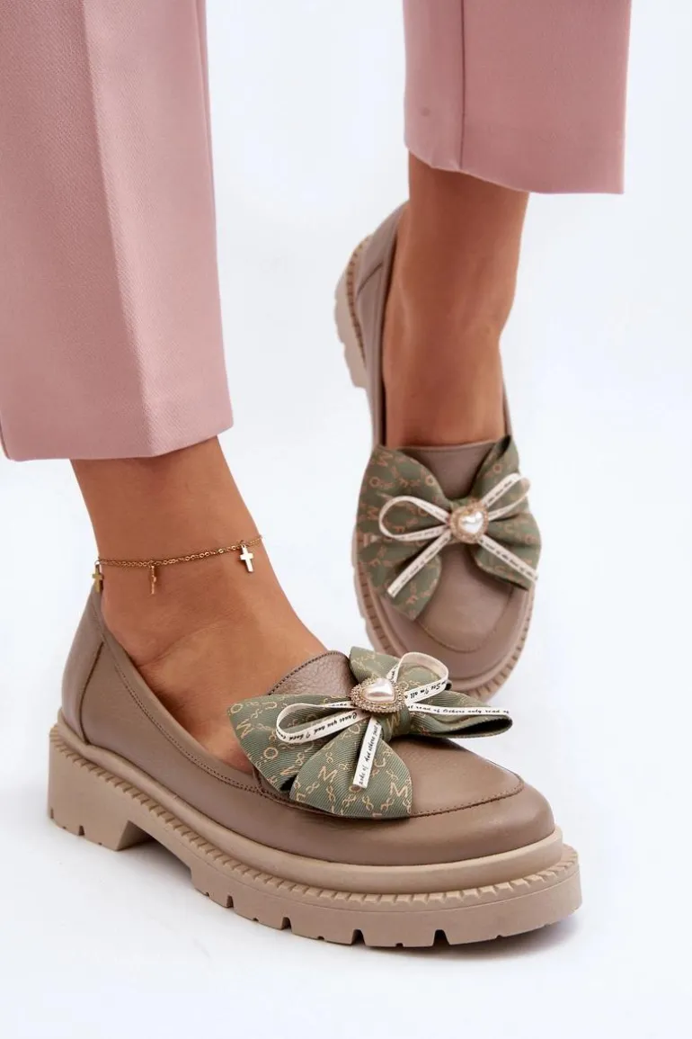 Mokasyny damskie wykonane ze skóry naturalnej. Ozdobione dużą kokardą z przodu. Osadzone na płaskim obcasie. Noski zaokrąglone. Miękka, skórzana wkładka zapewni wygodę podczas użytkowania. Ten niezwykle modny fason idealnie uzupełni wiele wiosennych stylizacji! Przy wyborze rozmiaru prosimy sugerować się tabelą rozmiarów.