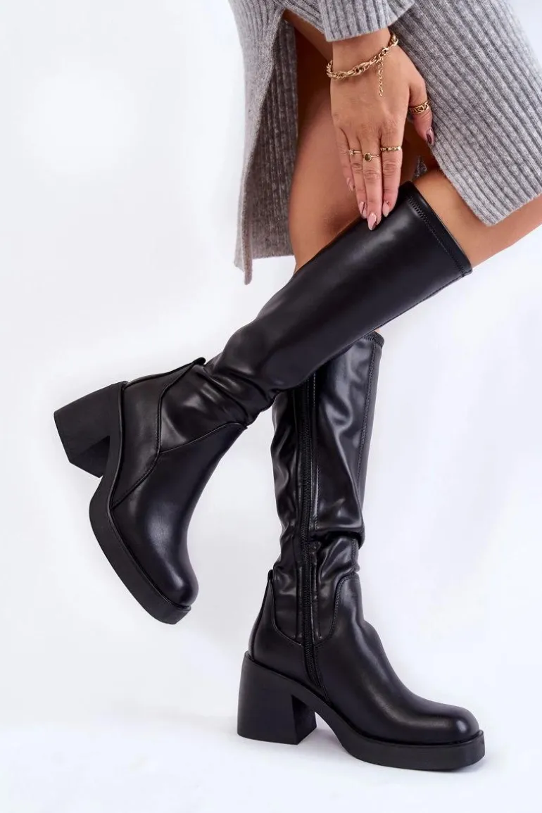 Klasyczne kozaki damskie zostały wykonane z eko skóry. Model ten posiada zapinanie na zamek błyskawiczny. W środku kozaki zostały ocieplone miłym w dotyku kocem obuwniczym. Osadzone na masywnym obcasie w postaci słupka. Model z kwadratowym noskiem. Dodatkowo zapiętek jest usztywniany. Koniecznie powinnaś je mieć! Przy wyborze rozmiaru prosimy sugerować się tabelą rozmiarów.