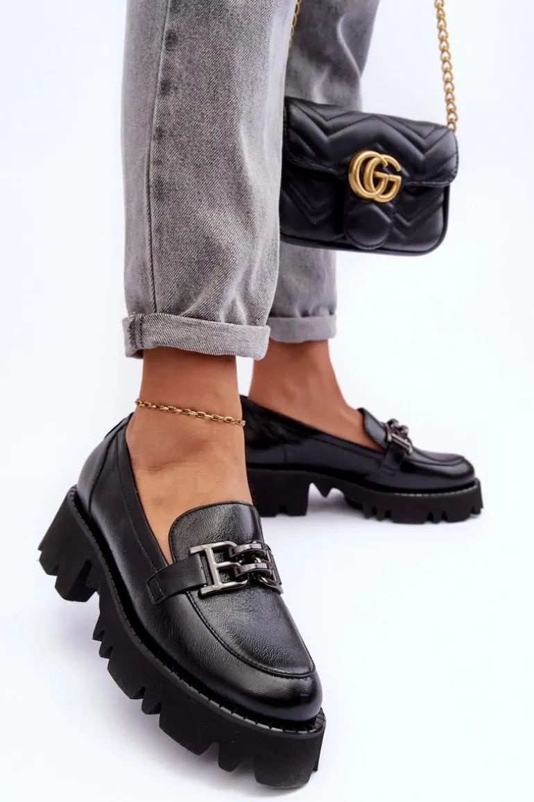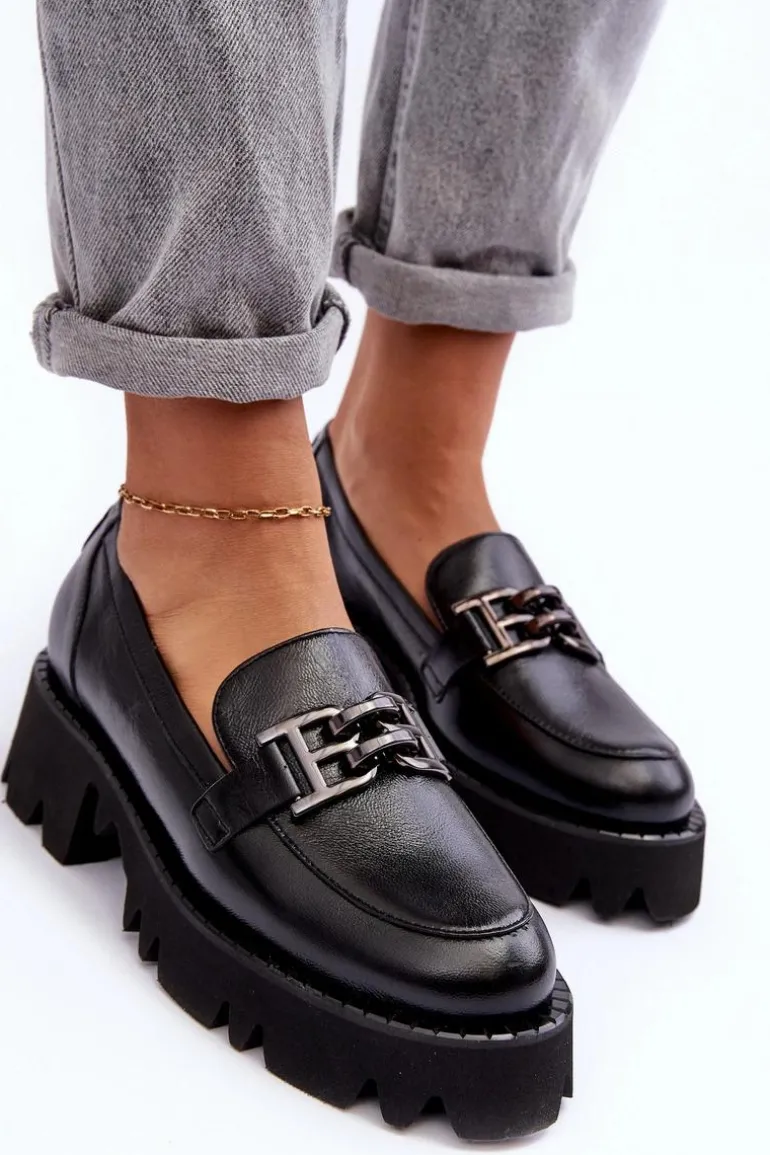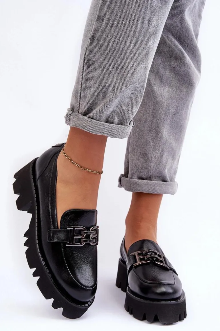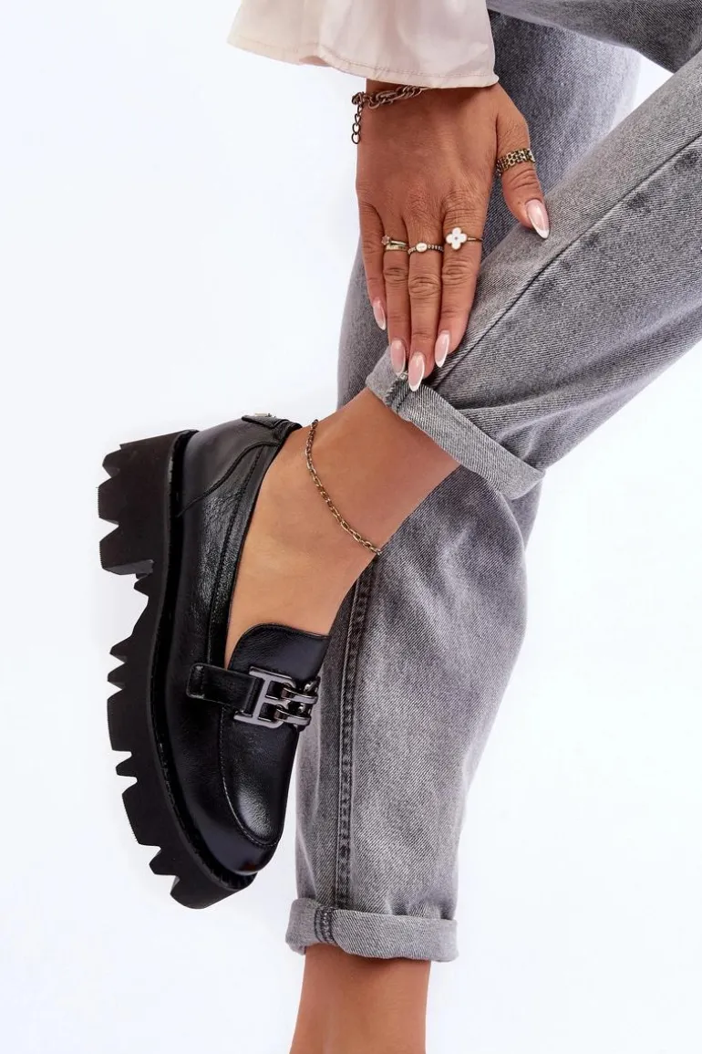 Eleganckie półbuty damskie osadzone na masywnej platformie i płaskim, stabilnym obcasie. Wykonane ze skóry naturalnej. Model klasyczny, wsuwany. Zapiętek usztywniony, noski zaokrąglone. Z przodu znajduje się ozdoba z tworzywa sztucznego. Miękka skórzana wkładka zapewni komfortowe użytkowanie obuwia. Buty te sprawdzą się w wielu stylizacjach! Koniecznie sprawdź całą naszą kolekcję półbutów! Przy wyborze rozmiaru prosimy sugerować się tabelą rozmiarów.