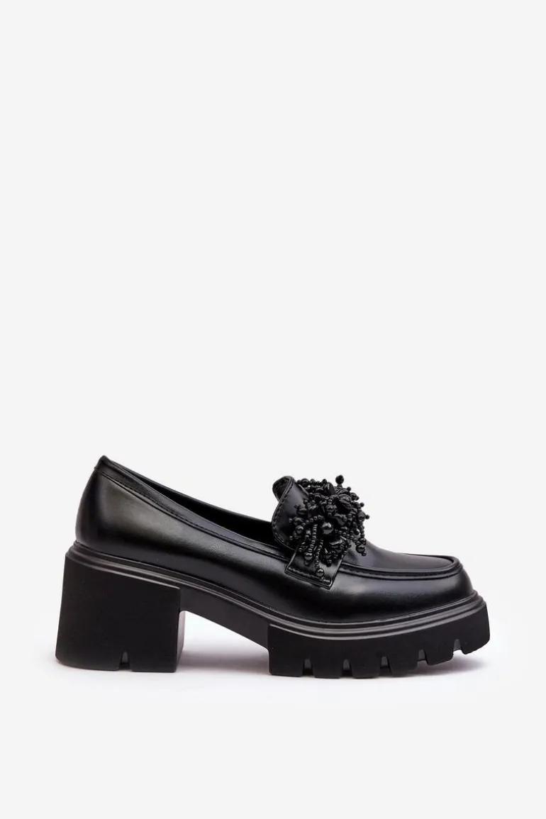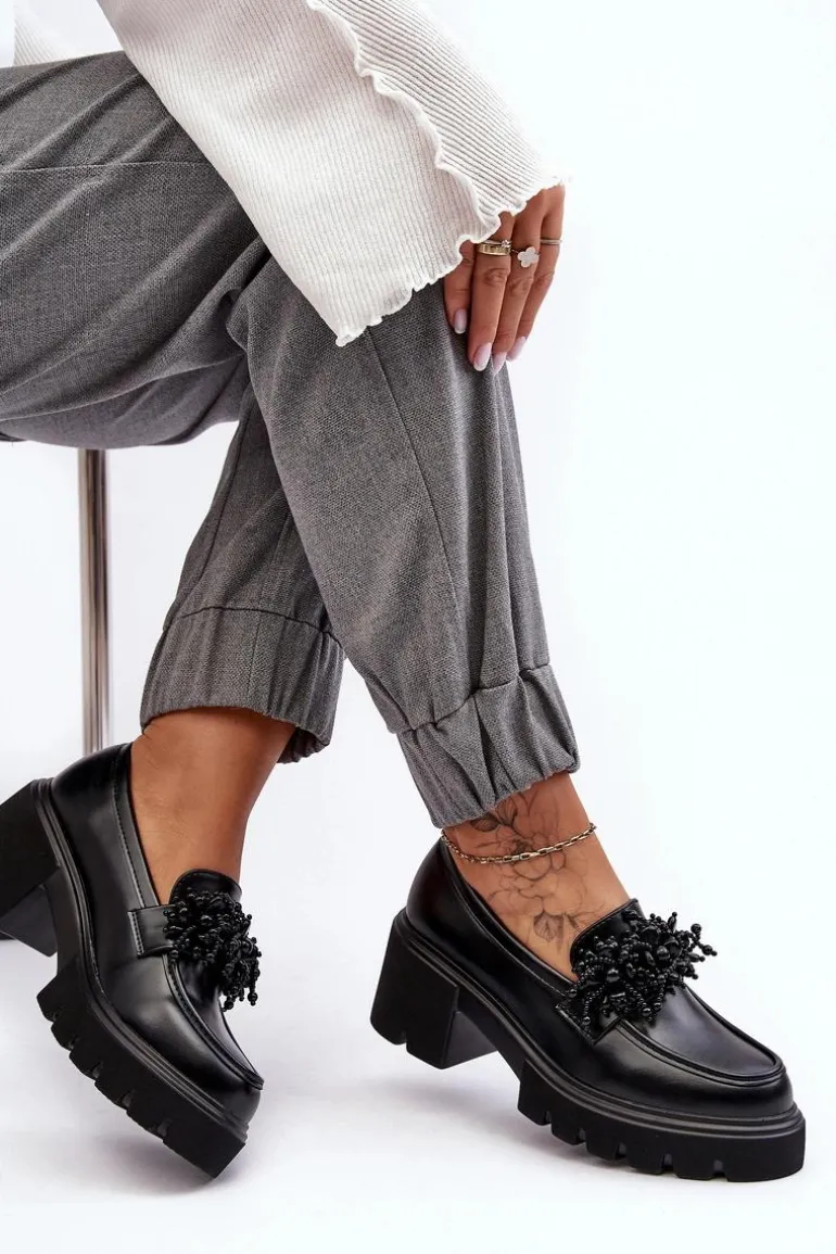 Stylowe półbuty damskie z ozdobą na pasku. Osadzone grubej podeszwie i masywnym, niskim obcasie. Noski zaokrąglone. Usztywniony zapiętek. Eko skórzana wkładka zapewni komfort podczas użytkowania. Model ten będzie idealny do wielu jesiennych stylizacji! Przy wyborze rozmiaru prosimy sugerować się tabelą rozmiarów.