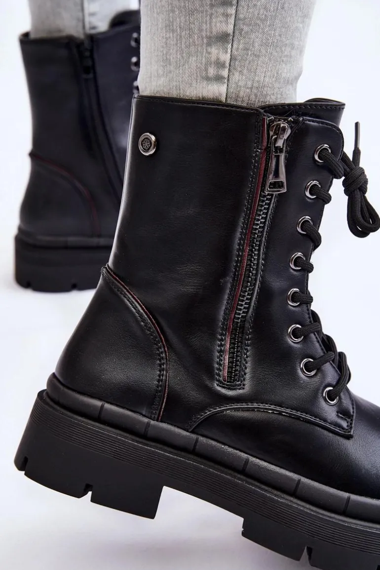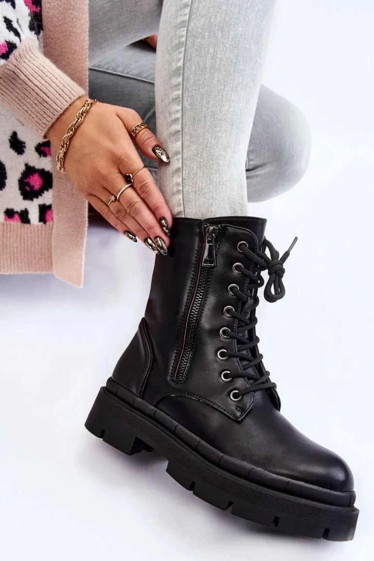 Klasyczne, damskie trapery zostały wykonane z eko skóry. Model posiada solidne sznurowanie oraz suwak. Dodatkowo po zewnętrznej stronie znajduje się ozdobny suwak. Botki osadzono na płaskim obcasie oraz podeszwie z bieżnikiem. Zapiętek jest usztywniany. Trapery nie posiadają ocieplenia. Ten klasyczny model powinien znaleźć się w Twojej szafie! Przy wyborze rozmiaru prosimy sugerować się tabelą rozmiarów.