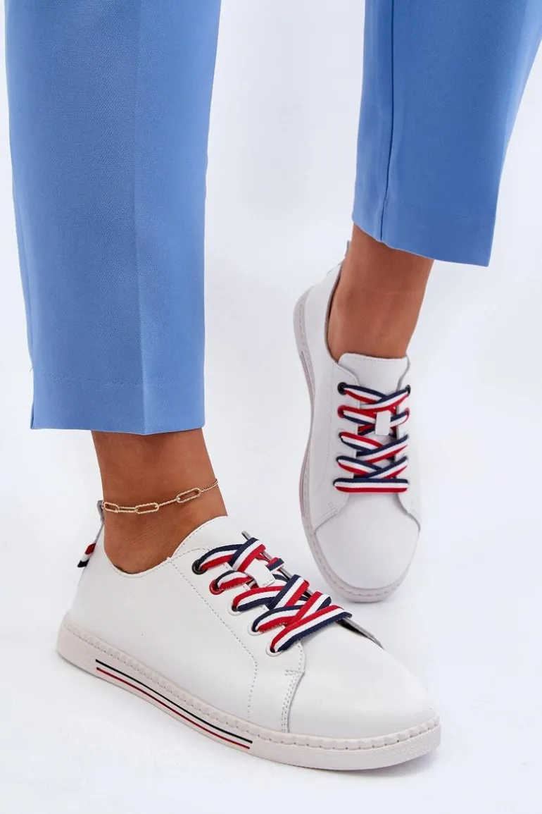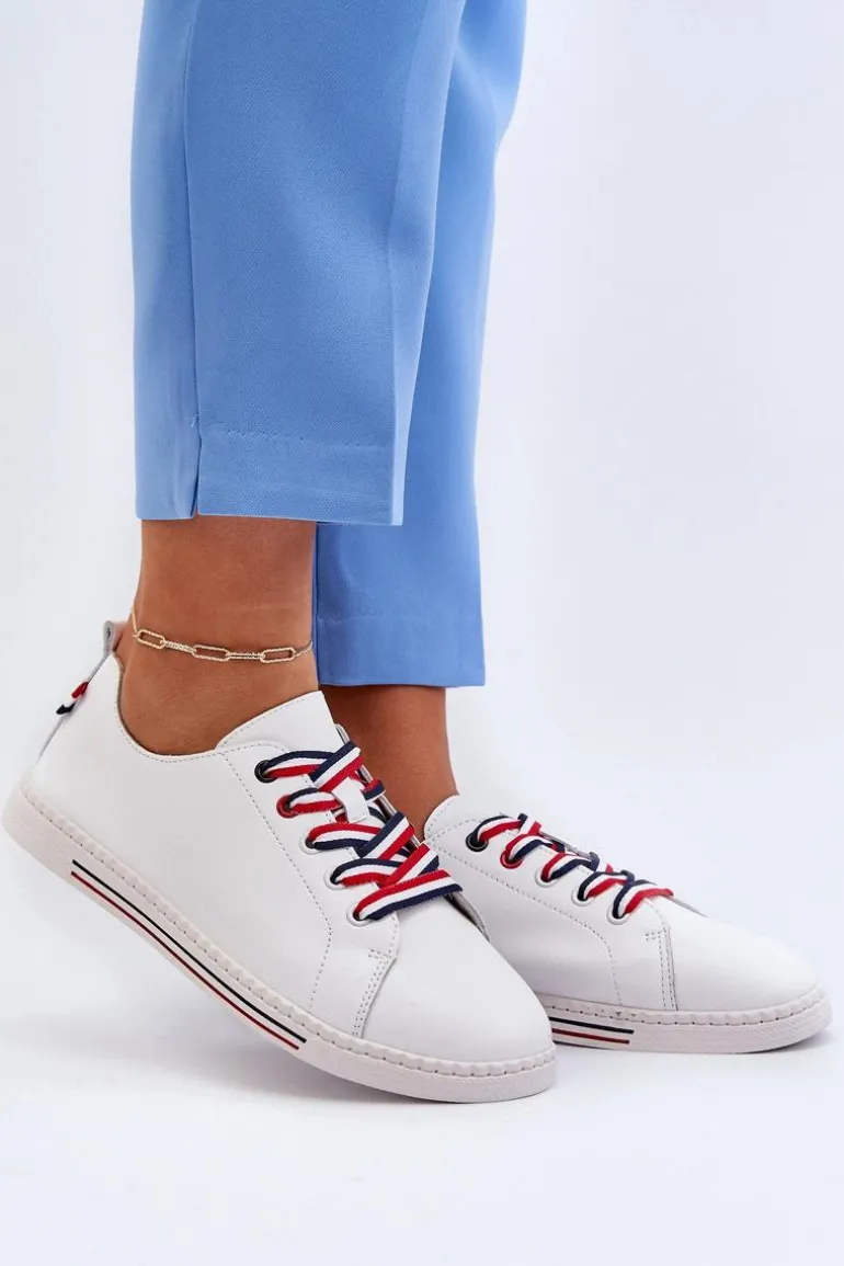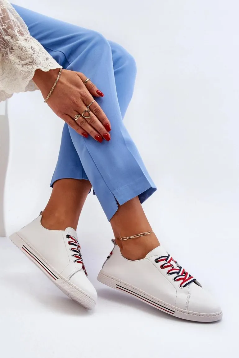 Tenisówki damskie wykonane z naturalnej skóry. Ich klasyczny design pozwala na łatwe dopasowanie do różnych stylizacji, a sznurowanie zapewnia pewne trzymanie stopy. Model ten posiada antypoślizgową podeszwę, co sprawia, że są one bezpieczne na różnych rodzajach nawierzchni. Klasyczny fason, który będzie pasować zarówno do spodni, jak i sukienek, spódnic. Przy wyborze rozmiaru prosimy sugerować się tabelą rozmiarów.