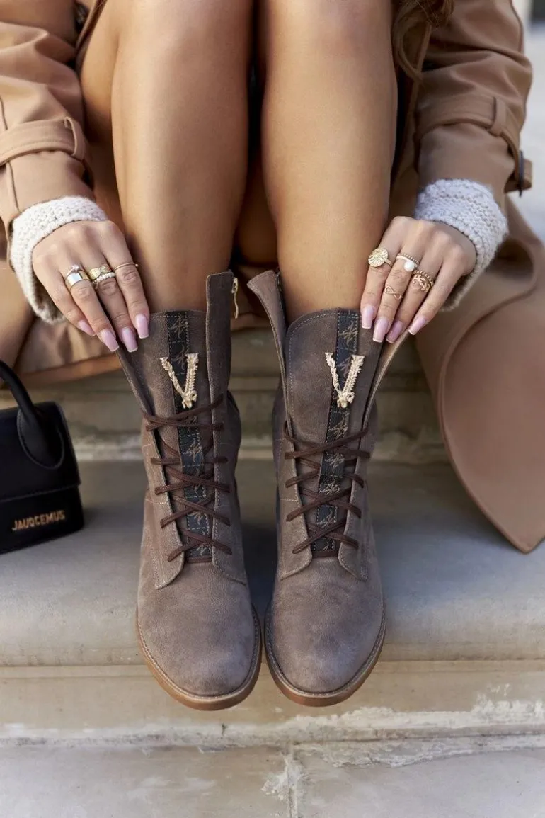 Przepiękne i modne botki marki Nicole. Buty w całości wykonane z naturalnej skóry welurowej. Wysokie botki sięgające aż do łydek. Delikatne zdobienie na języku w postaci złotej literki V. Klasycznie sznurowane z dodatkowym suwakiem na boku. Sprawdź całą kolekcję marki Nicole. Przy wyborze rozmiaru prosimy sugerować się tabelą rozmiarów.