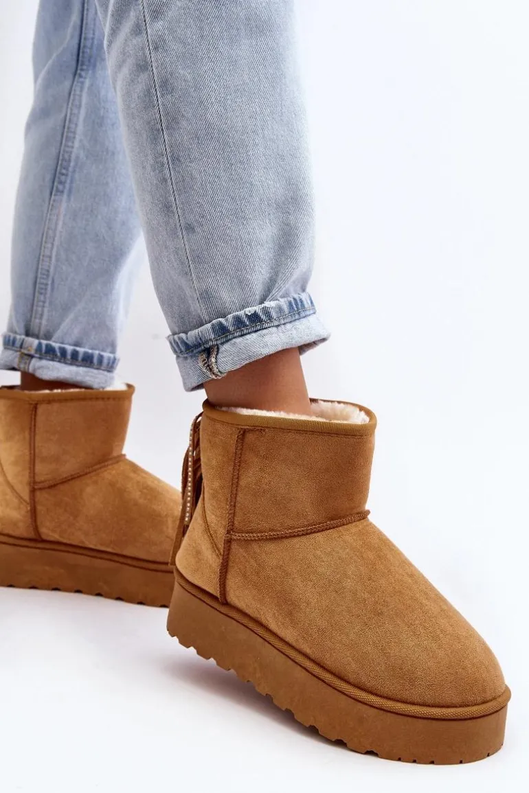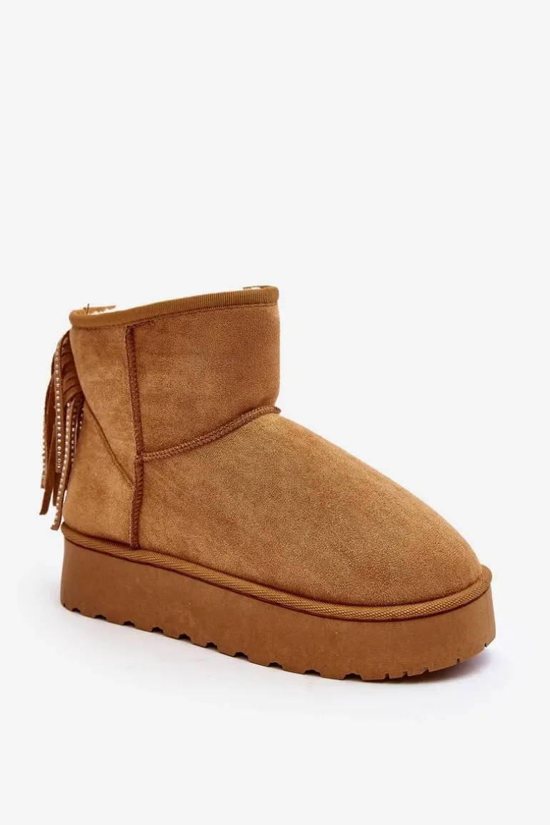 Damskie śniegowce wykonane z eko zamszu. Osadzone na masywnej podeszwie z gumowego tworzywa. Cholewka za kostkę ozdobiona frędzlami z tyłu. Środek ocieplony grubym futerkiem. Model ten występuje również w rozmiarówce dziecięcej. Stwórz komplet mama + dziecko! Przy wyborze rozmiaru prosimy sugerować się tabelą rozmiarów.