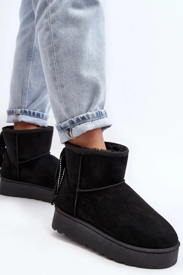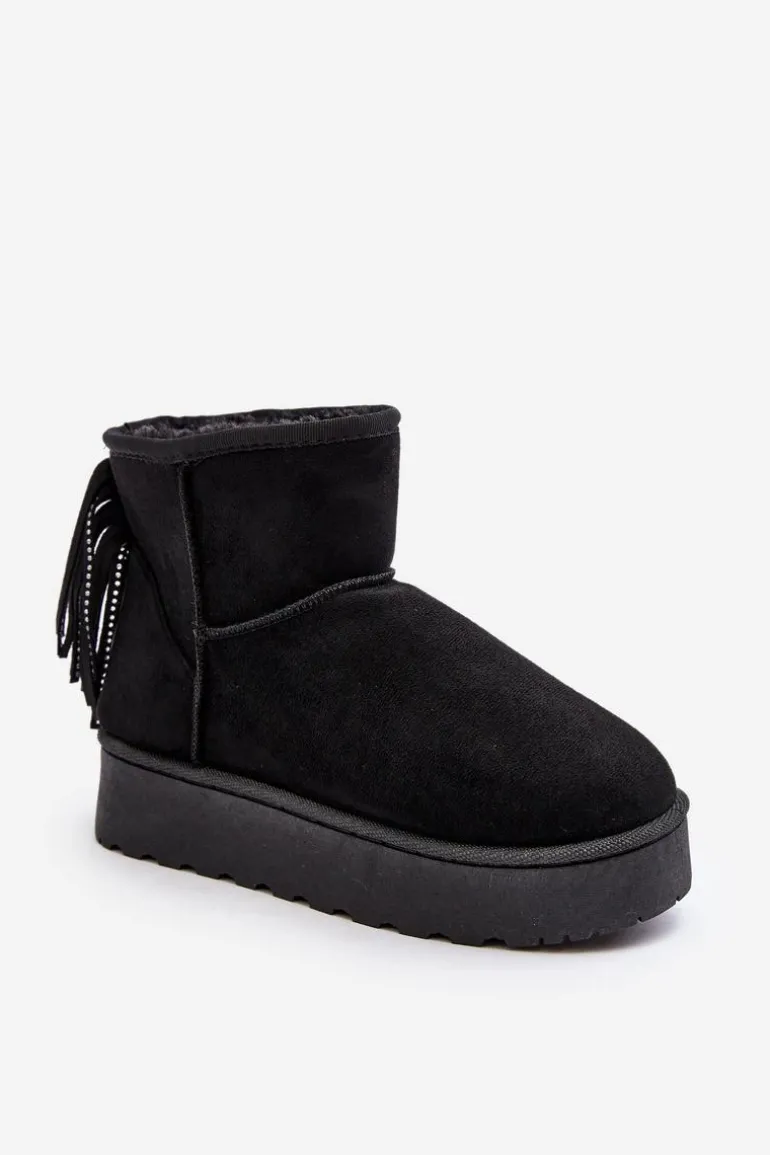 Damskie śniegowce wykonane z eko zamszu. Osadzone na masywnej podeszwie z gumowego tworzywa. Cholewka za kostkę ozdobiona frędzlami z tyłu. Środek ocieplony grubym futerkiem. Model ten występuje również w rozmiarówce dziecięcej. Stwórz komplet mama + dziecko! Przy wyborze rozmiaru prosimy sugerować się tabelą rozmiarów.