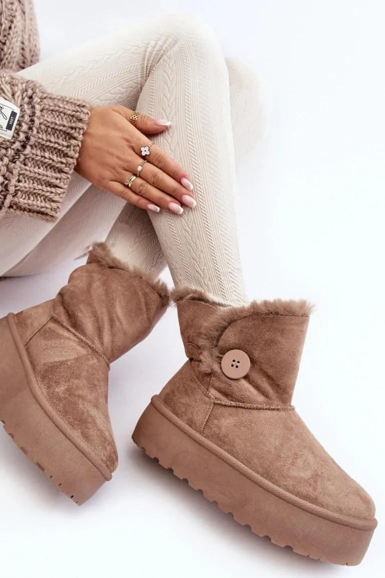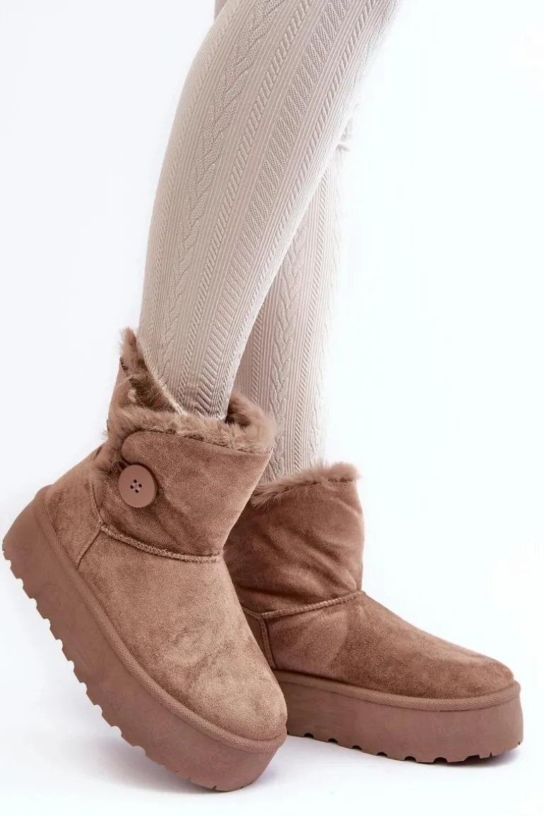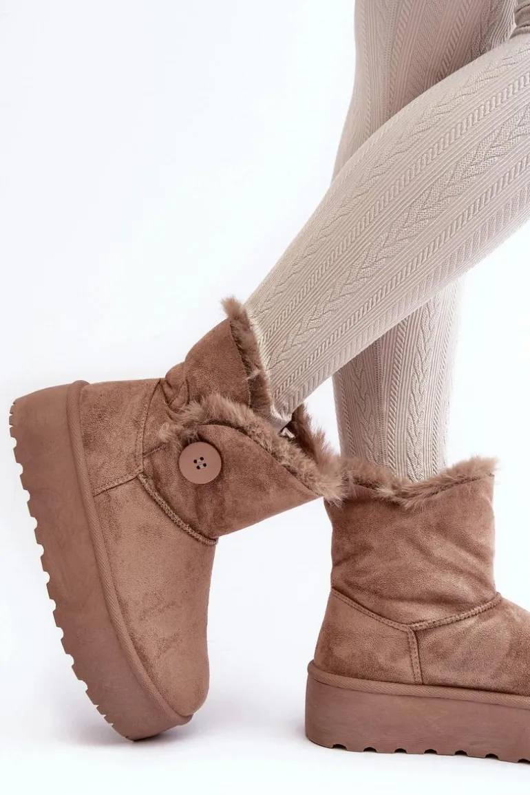 Śniegowce damskie osadzone na grubej platformie z gumowego tworzywa. Cholewka za kostkę, ozdobiona guzikiem i futerkiem. Wykonane z eko zamszu. Środek ocieplony. Ten modny model świetnie sprawdzi się w sezonie jesienno-zimowym. Koniecznie musisz je mieć! Przy wyborze rozmiaru prosimy sugerować się tabelą rozmiarów.