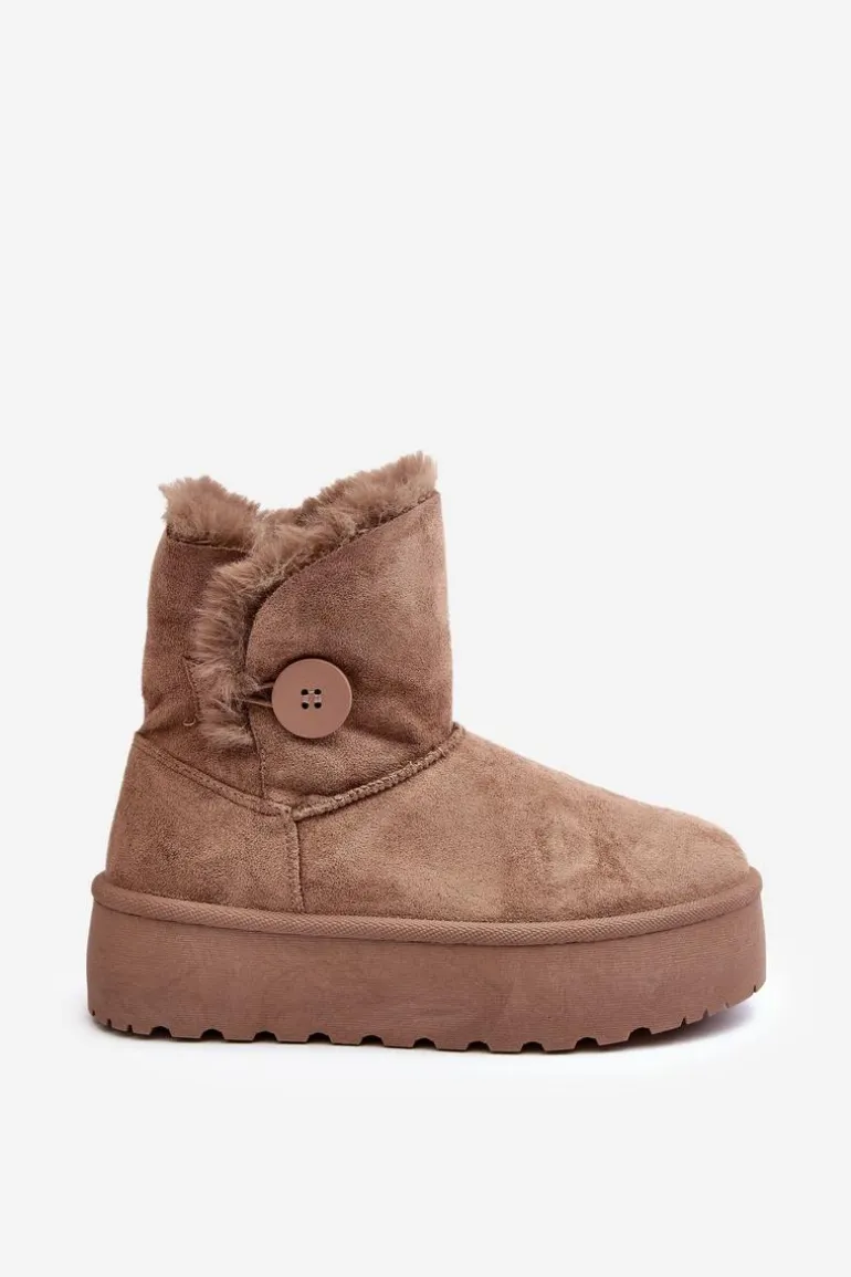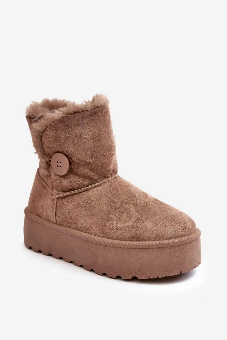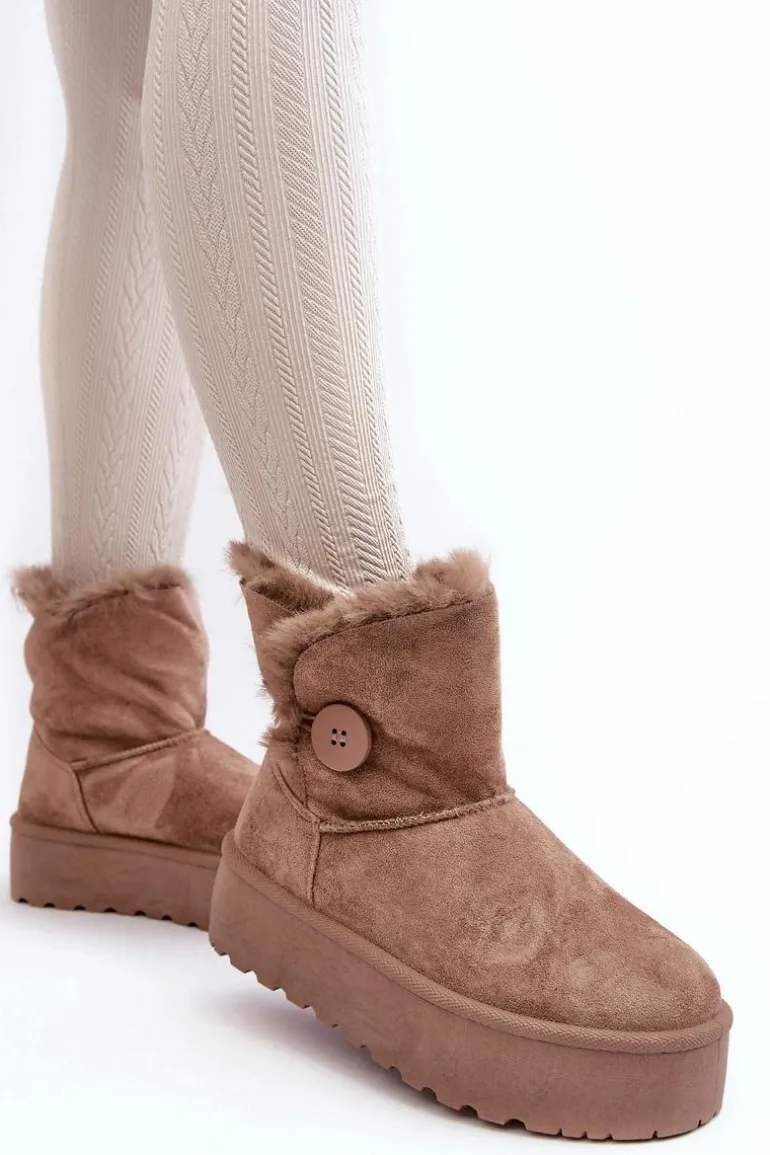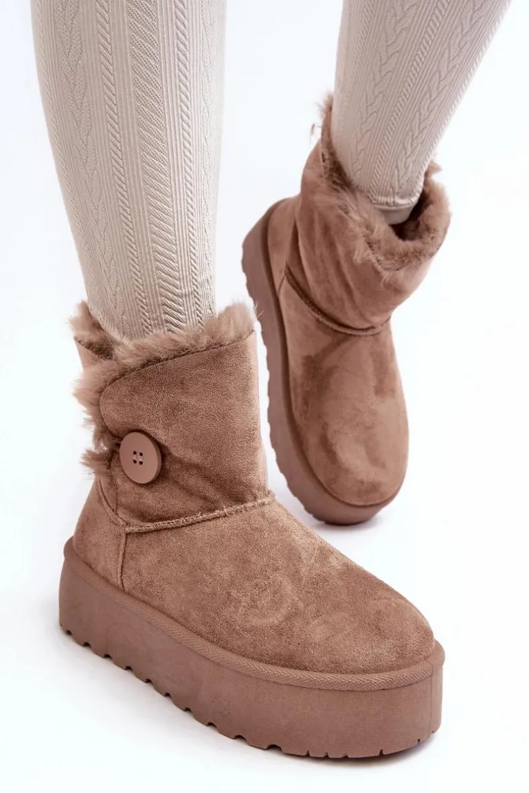 Śniegowce damskie osadzone na grubej platformie z gumowego tworzywa. Cholewka za kostkę, ozdobiona guzikiem i futerkiem. Wykonane z eko zamszu. Środek ocieplony. Ten modny model świetnie sprawdzi się w sezonie jesienno-zimowym. Koniecznie musisz je mieć! Przy wyborze rozmiaru prosimy sugerować się tabelą rozmiarów.