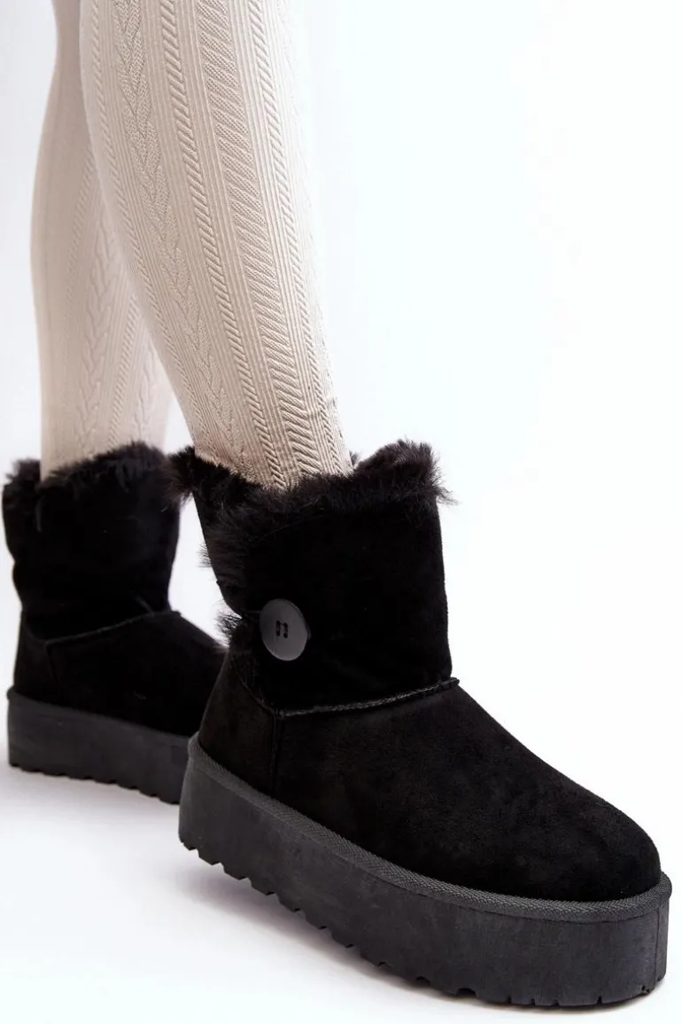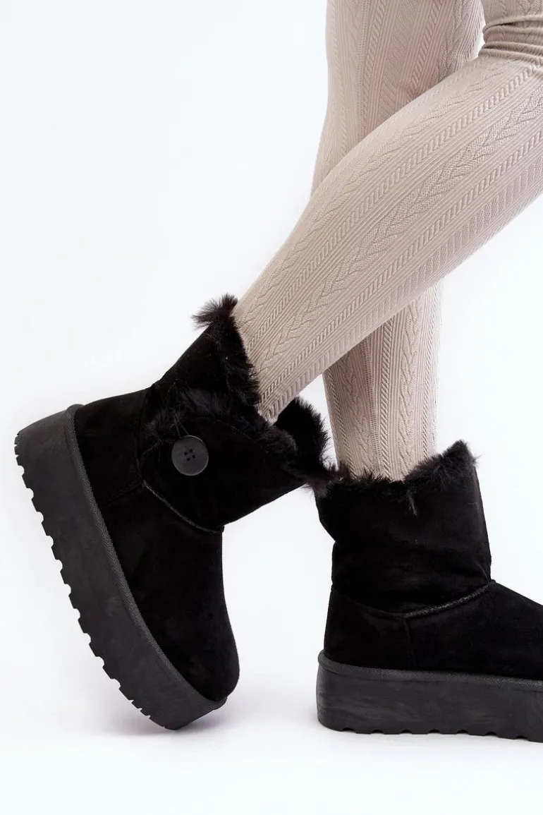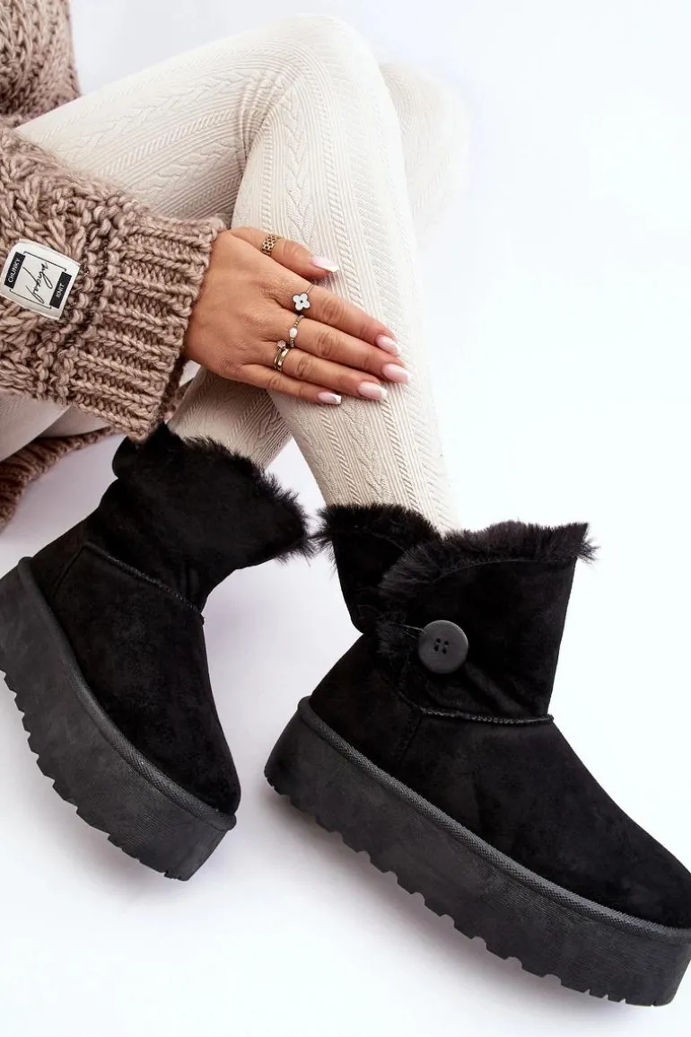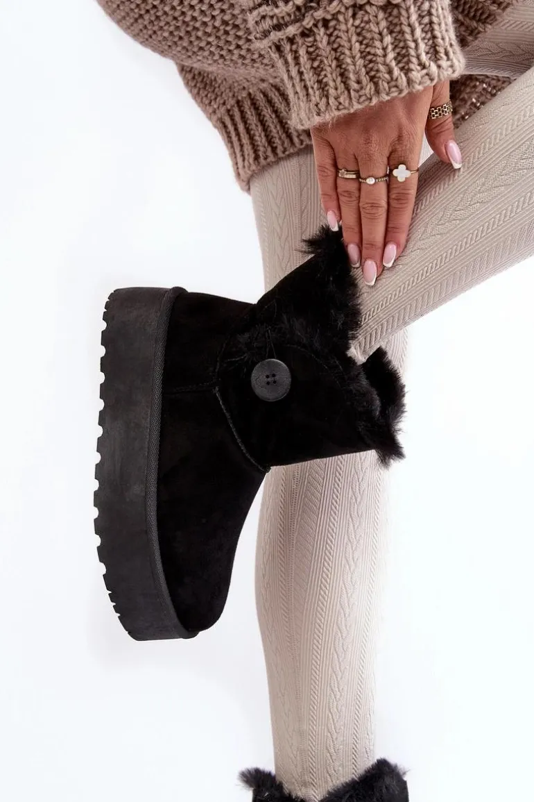 Śniegowce damskie osadzone na grubej platformie z gumowego tworzywa. Cholewka za kostkę, ozdobiona guzikiem i futerkiem. Wykonane z eko zamszu. Środek ocieplony. Ten modny model świetnie sprawdzi się w sezonie jesienno-zimowym. Koniecznie musisz je mieć! Przy wyborze rozmiaru prosimy sugerować się tabelą rozmiarów.