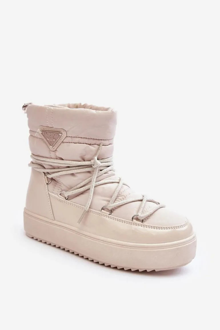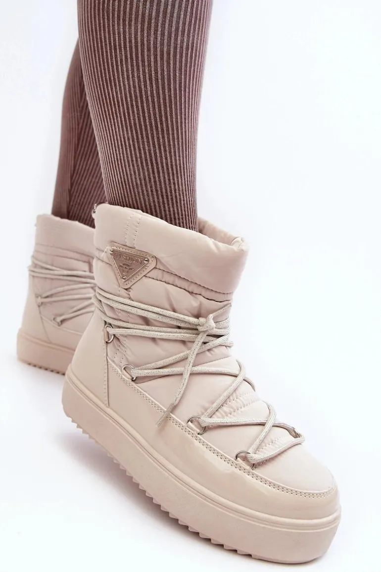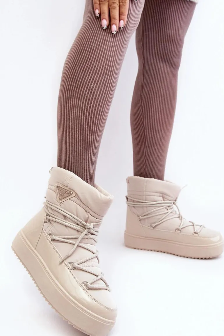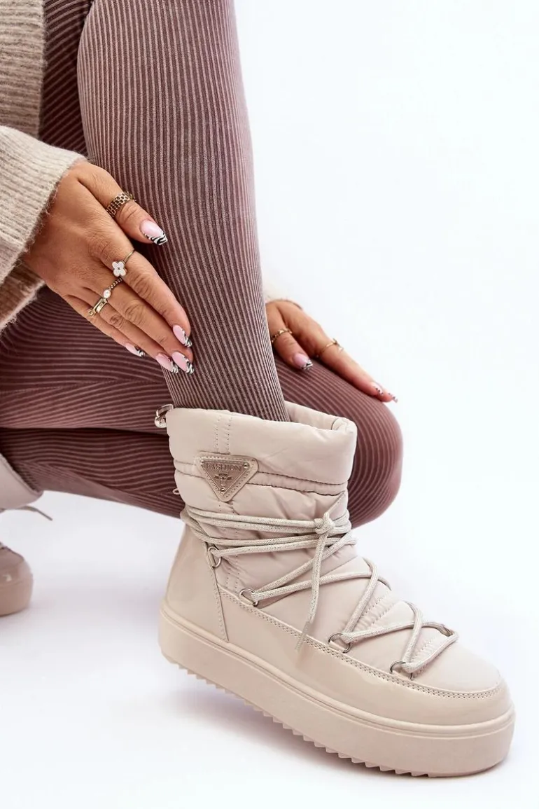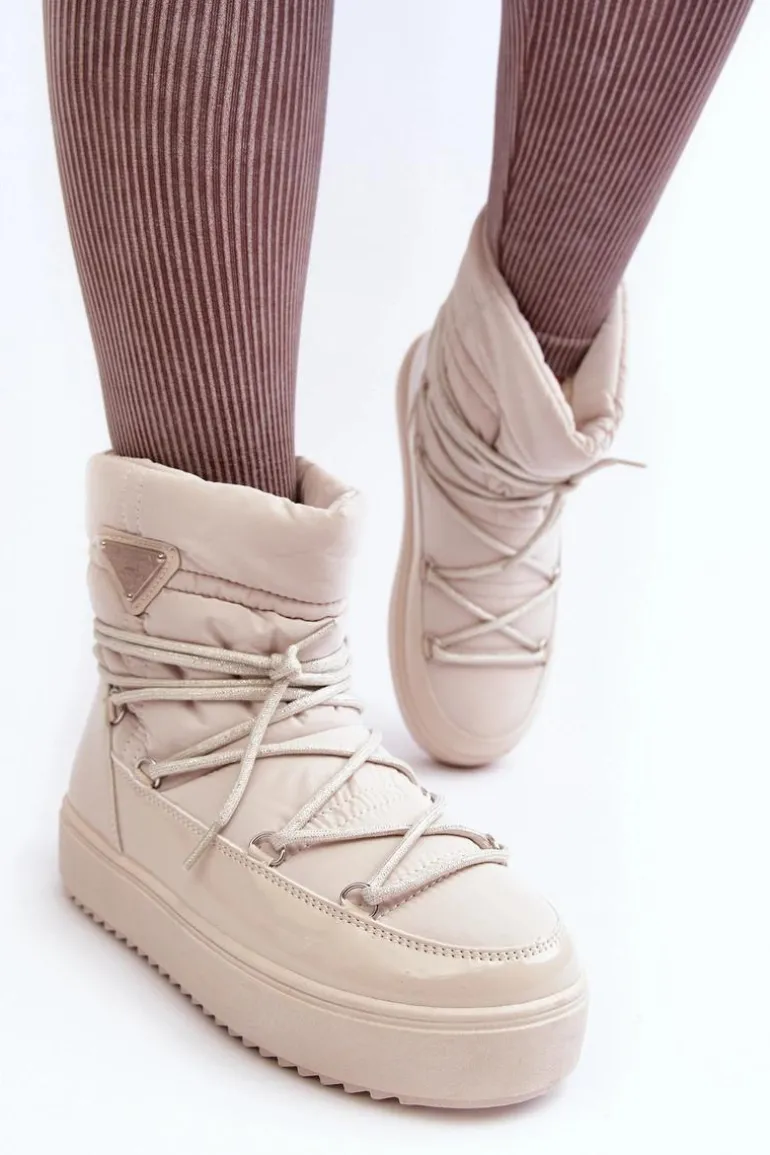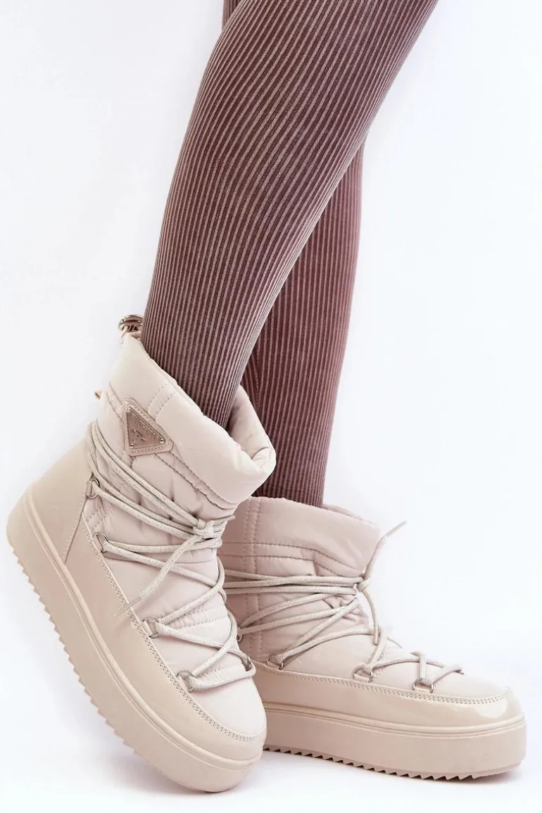 Śniegowce damskie z cholewką za kostkę. Wykonane z połączenia materiału tekstylnego i eko skóry. Osadzone na grubej podeszwie, która świetnie odizoluje od zimnego podłoża. Model wsuwany z błyszczącymi sznurówkami. Środek ocieplony futerkiem. Idealne na mroźne dni! Koniecznie powinnaś je mieć! Przy wyborze rozmiaru prosimy sugerować się tabelą rozmiarów.
