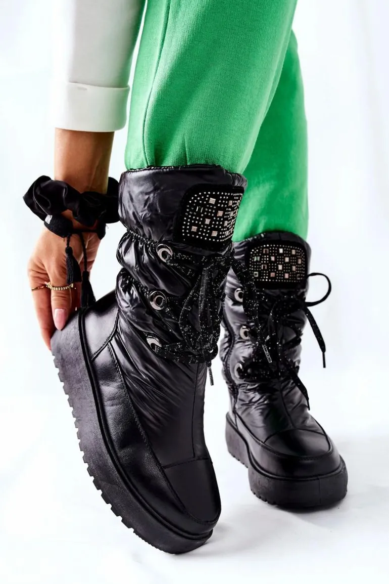 Buty wewnątrz są niesamowicie miłe w dotyku dzięki zastosowaniu ocieplenia w postaci kożuszka. Zewnętrzna część buta została wykonana z materiału tekstylnego. Buty klasycznie sznurowane oraz zapinane na zamek Zdobione kamyczkami na cholewce. W tych śniegowcach żadna pogoda nie będzie Ci straszna! Przy wyborze rozmiaru prosimy kierować tabelą rozmiarów.
