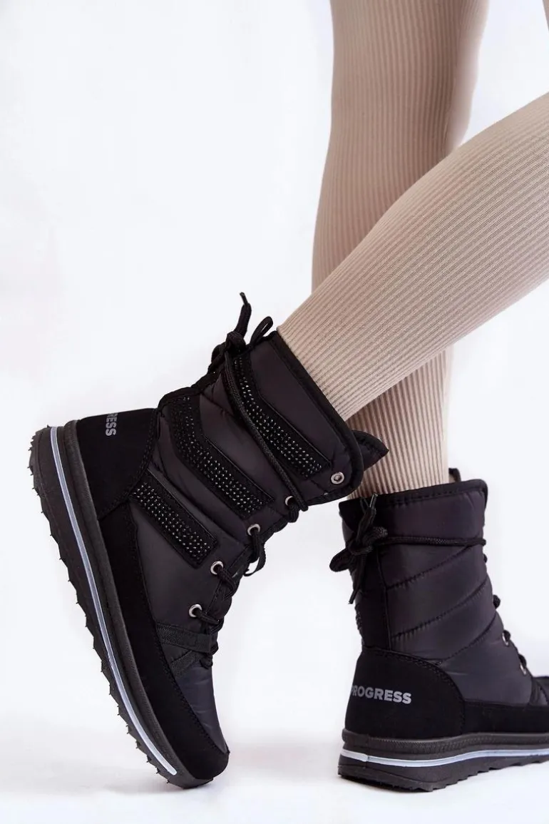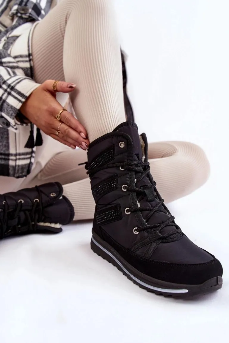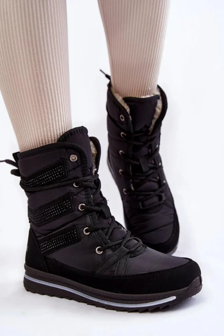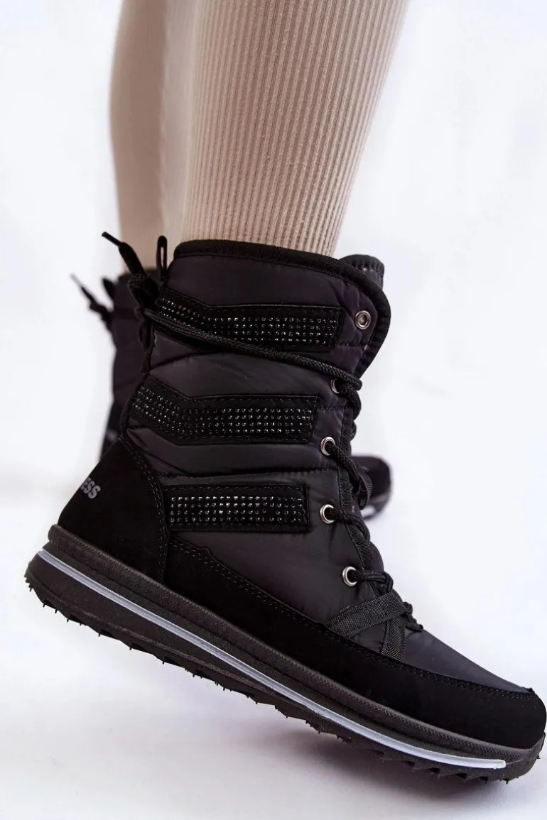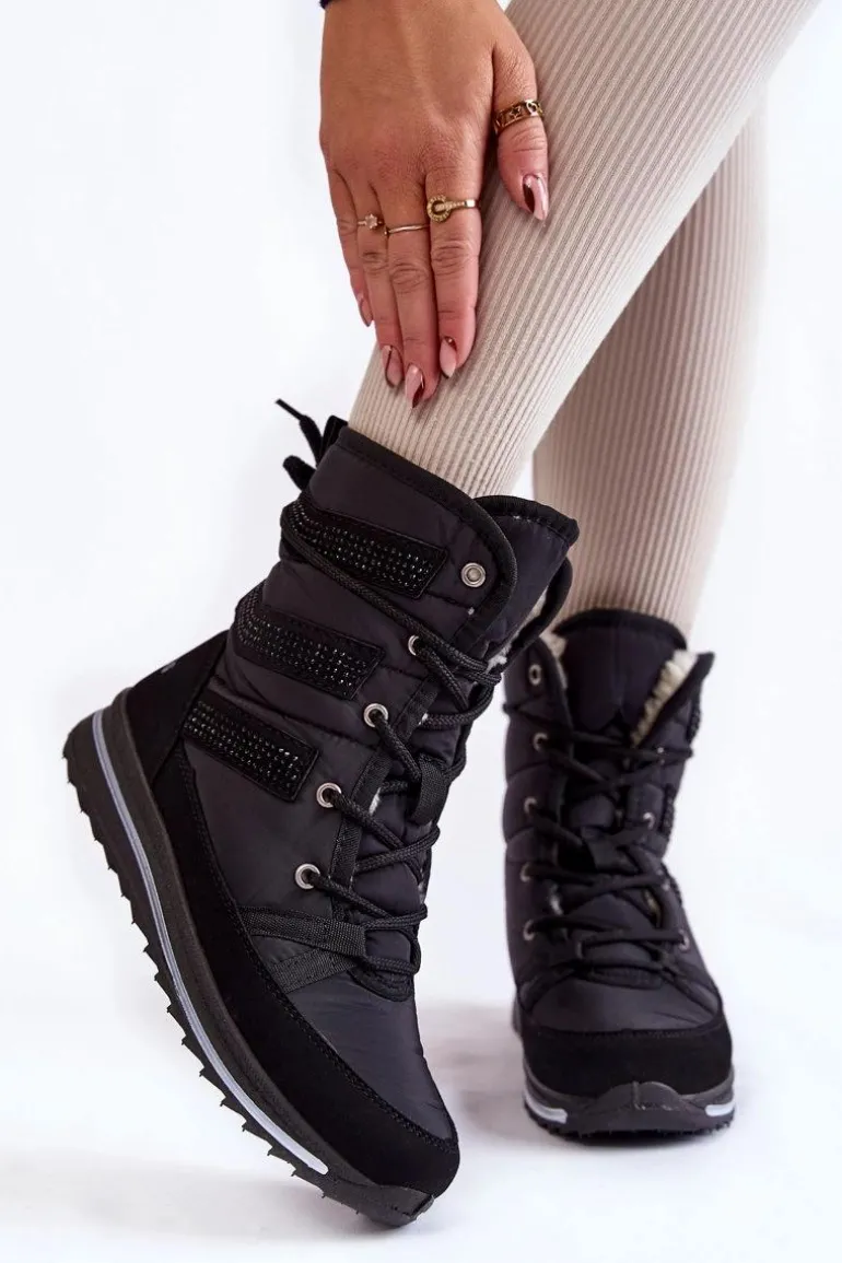 Damskie śniegowce zostały wykonane z nieprzemakalnych materiałów. Posiadają klasyczne sznurowanie, które pozwoli na odpowiednie dopasowanie obuwia do tęgości nogi. Botki są osadzone na platformie z bieżnikiem. Śniegowce zostały ozdobione z boku cholewki dżetami. Wnętrze ocieplone grubym futerkiem. Przy wyborze rozmiaru, prosimy sugerować się tabelą rozmiarów.