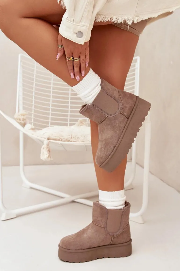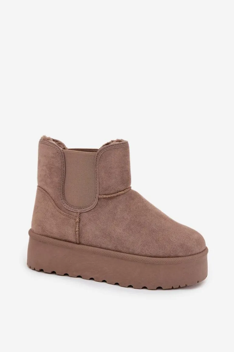 Modne śniegowce damskie osadzone na platformie, która skutecznie izoluje od zimnego podłoża, to doskonały wybór na zimowe dni. Wykonane z eko zamszu, zapewniają elegancki wygląd, a elastyczne wstawki w cholewce gwarantują wygodę i dopasowanie. Ocieplenie grubym futerkiem zapewnia ciepło nawet w najchłodniejsze dni. Ten stylowy fason doskonale komponuje się z różnymi zimowymi stylizacjami. Przy wyborze rozmiaru prosimy sugerować się tabelą rozmiarów.