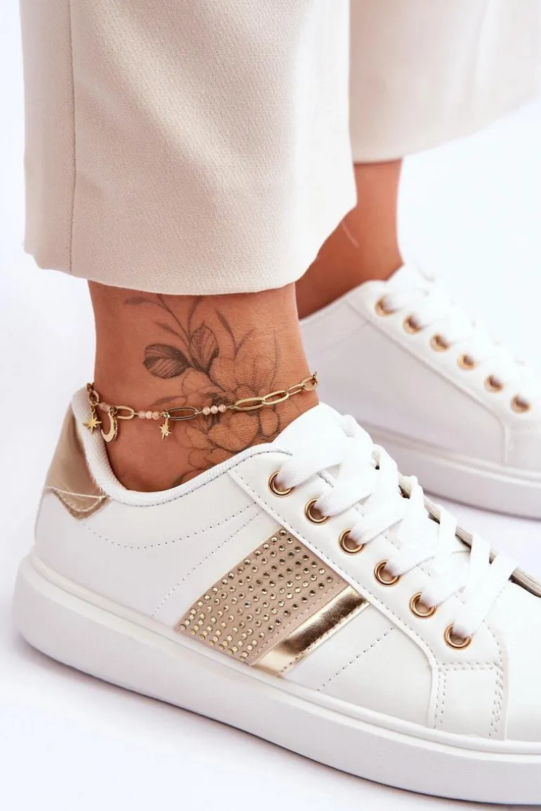 Damskie buty sportowe zostały wykonane z eko skóry. Model ten jest klasycznie sznurowany. Buty posiadają z boku cholewki ozdobne dżety. Świetnie sprawdzą się jako obuwie na co dzień, do pracy czy szkoły. Buty te osadzono na platformie. Wkładka została wykonana z materiału. Przy wyborze rozmiaru prosimy kierować się tabelą rozmiarów.