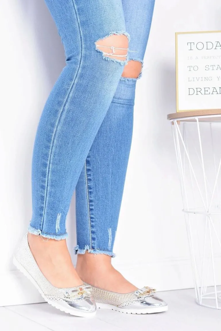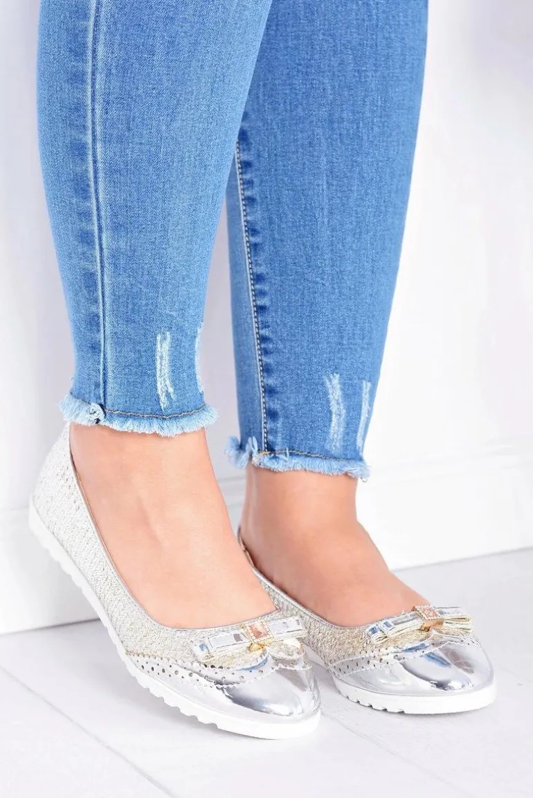 Damskie Srebrne Wsuwane Balerinki Z Kokardką Cleoss