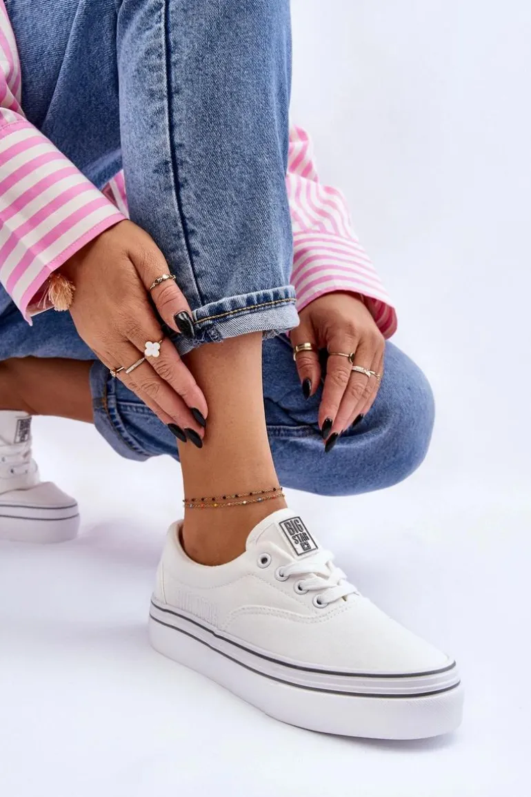 Niskie, damskie trampki marki Big Star zostały wykonane z materiału tekstylnego. Buty posiadają zaokrąglony nosek. Model ten posiada sznurowanie pozwalające na odpowiednie dopasowanie obuwia do tęgości nogi. Dodatkowo tenisówki posiadają antypoślizgową, gumową podeszwę. Zostały osadzone na masywnej platformie. Model ten świetnie sprawdzi się na co dzień do pracy czy szkoły. Przy wyborze rozmiaru prosimy sugerować się tabelą rozmiarów.