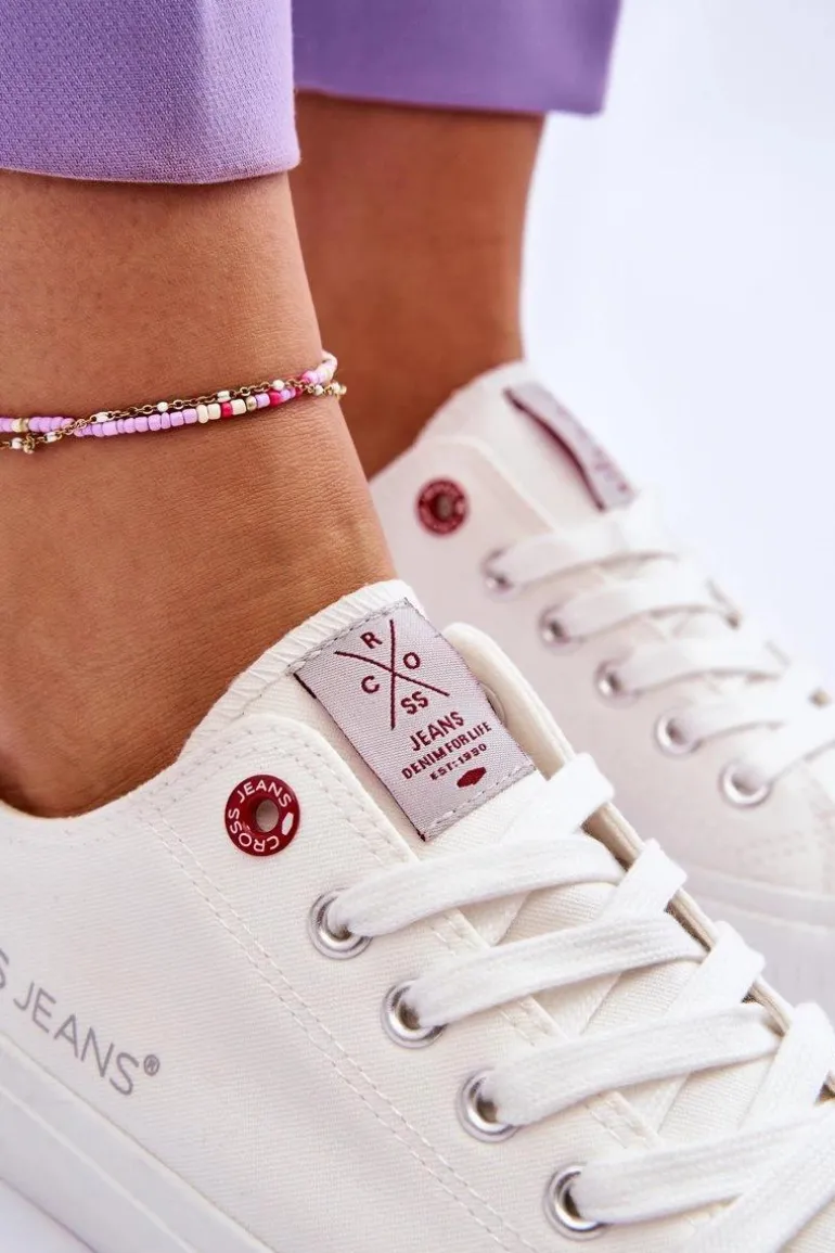 Klasyczne, damskie trampki marki Cross Jeans zostały wykonane z materiału tekstylnego. Buty te idealnie dopasowują się do kształtu stopy. Trampki posiadają miękką, materiałową wkładkę. Dodatkowo usztywniany zapiętek zapewni odpowiednią stabilizację stopy. Podeszwa wykonana z gumowego tworzywa jest antypoślizgowa. Klasyczny, sznurowany model, który łatwo dopasujesz do tęgości stopy. Trampki posiadają wzmocniony, gumowy nosek. Przy wyborze rozmiaru prosimy sugerować się tabelą rozmiarów.