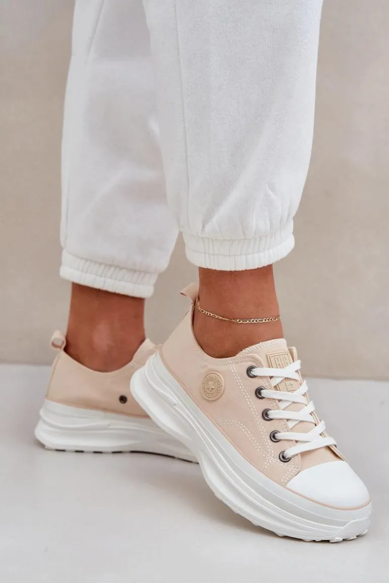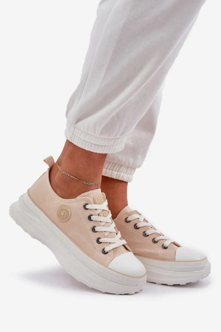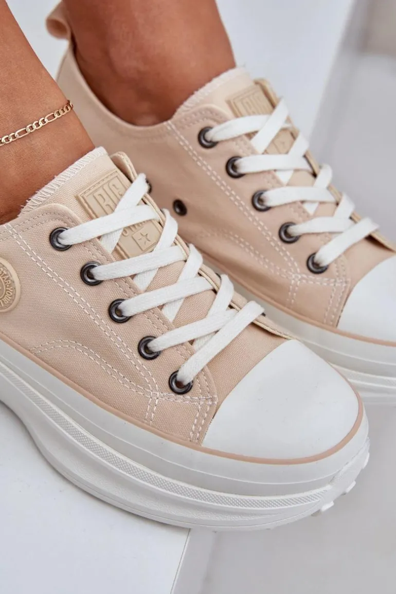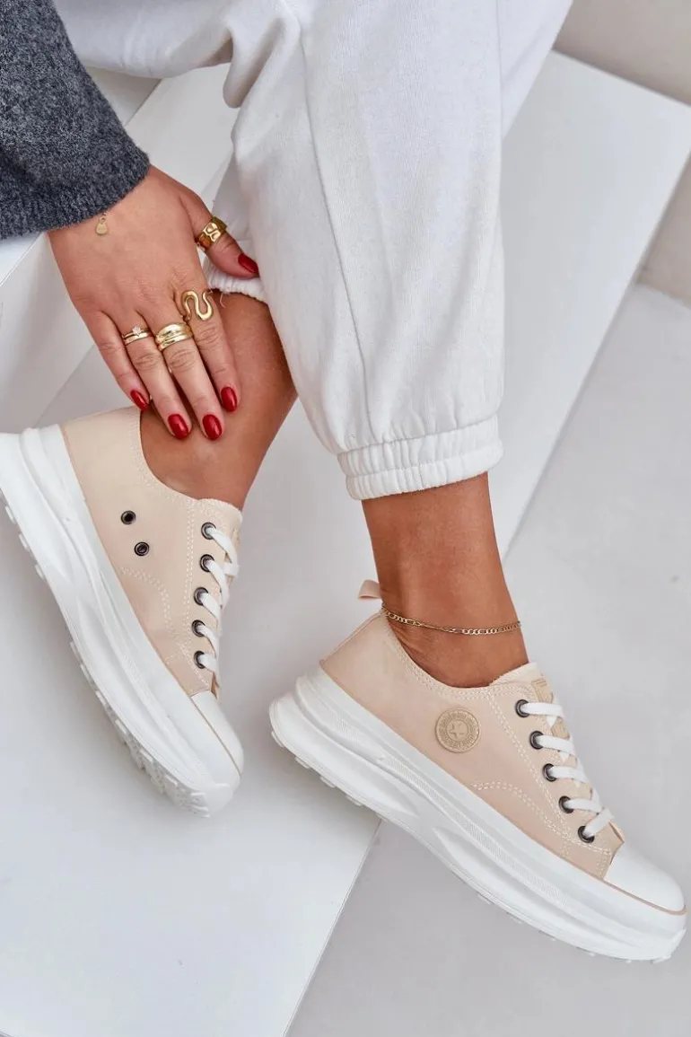 Trampki na platformie z logo Big Star to absolutny must-have dla tych, którzy cenią sobie modę i komfort. Dzięki platformie buty nie tylko świetnie wyglądają, ale także zapewniają stabilność i wsparcie dla stopy, co czyni je idealnym wyborem na długie spacery czy wieczorne wyjścia. Ich delikatny różowy kolor sprawia, że doskonale pasują do wielu stylizacji, dodając im nuty świeżości i oryginalności. Przy wyborze rozmiaru prosimy sugerować się tabelą rozmiarów.