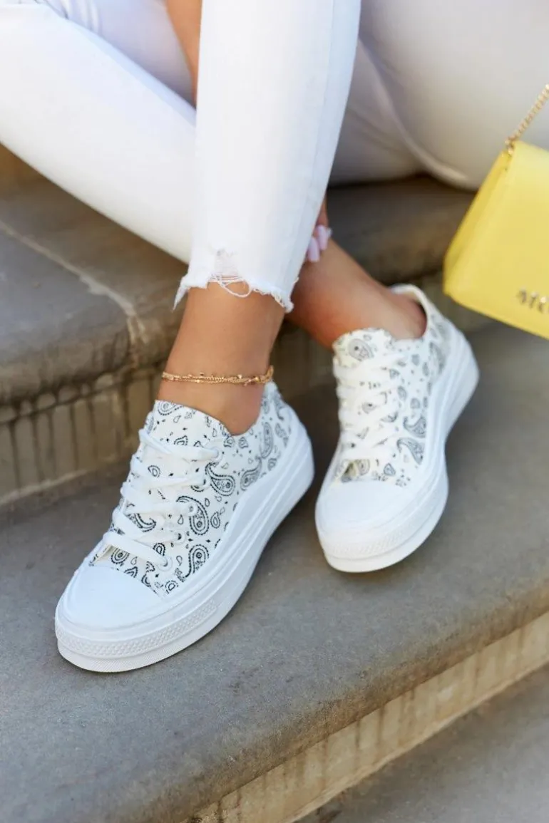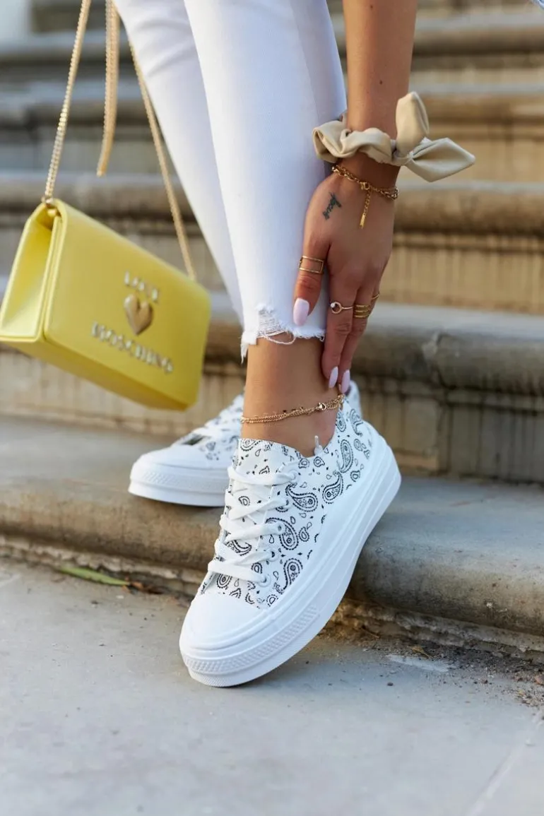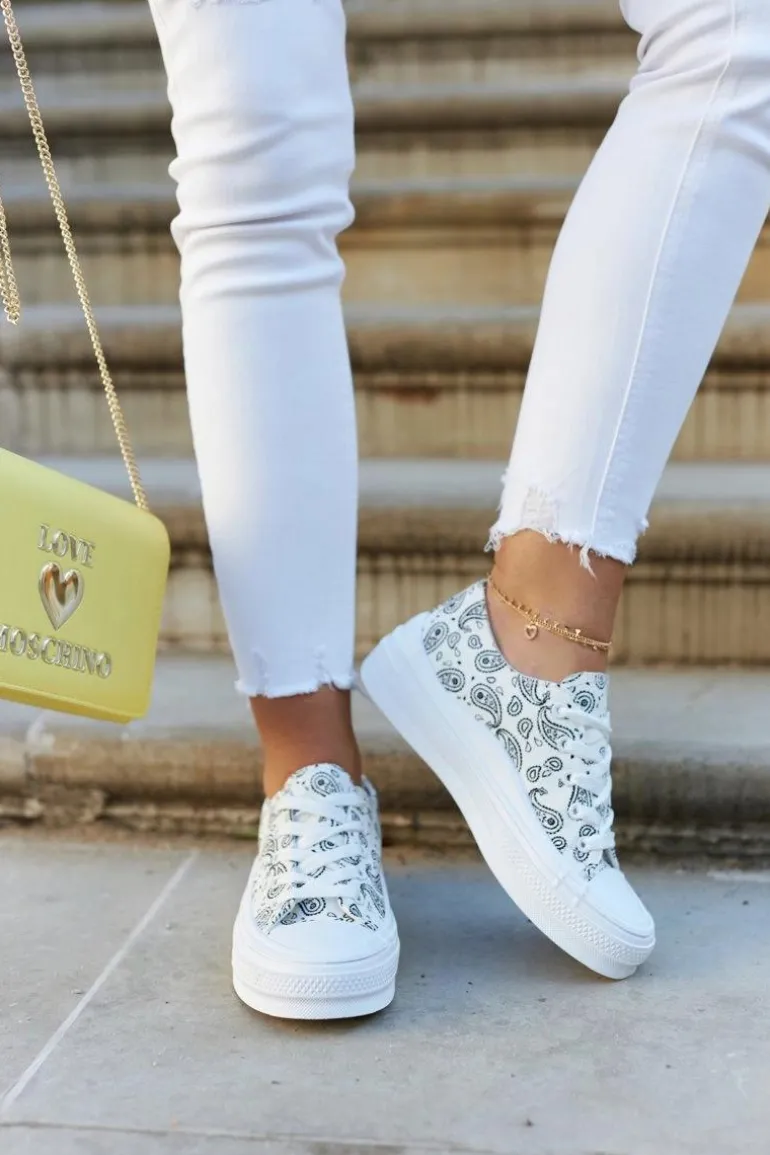 Trampki na masywnej, gumowej platformie w świetny print. Buty dobrze dopasowują się do kształtu stopy, dzięki cholewce wykonanej z materiału tekstylnego. Posiadają klasyczne, płaskie sznurowadła oraz wyciąganą, wkładkę, która jest wykonana także z materiału. Idealne na co dzień, do szkoły, czy na spotkanie ze znajomymi. Koniecznie sprawdź całą naszą kolekcję trampek! Przy wyborze rozmiaru prosimy sugerować się tabelą rozmiarów.
