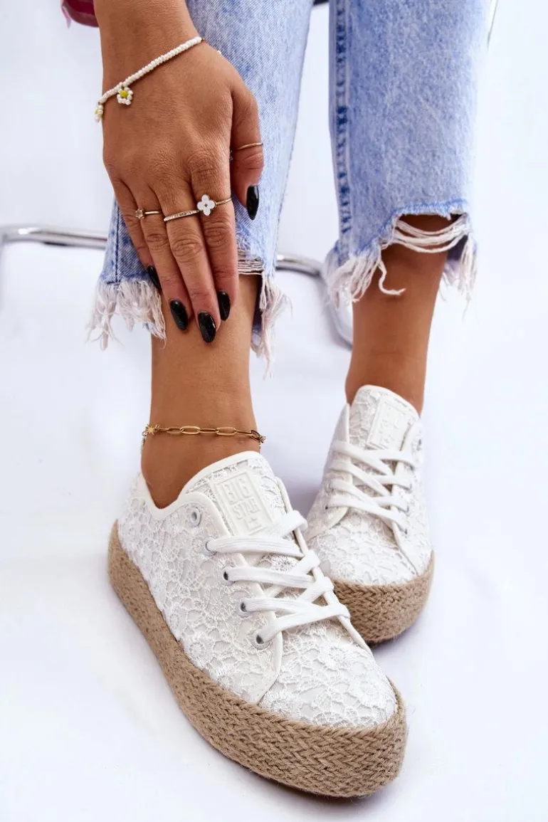 Damskie trampki polskiej marki Big Star zostały wykonane z materiału tekstylnego i dodatkowo ozdobione haftami. Buty te posiadają miękką, materiałową wkładkę oraz antypoślizgową podeszwę wykonaną z gumowego tworzywa. Trampki zostały osadzone na platformie ozdobionej jutowym warkoczem. Koniecznie sprawdź całą naszą kolekcję butów BIG STAR.Przy wyborze rozmiaru prosimy sugerować się tabelą rozmiarów.