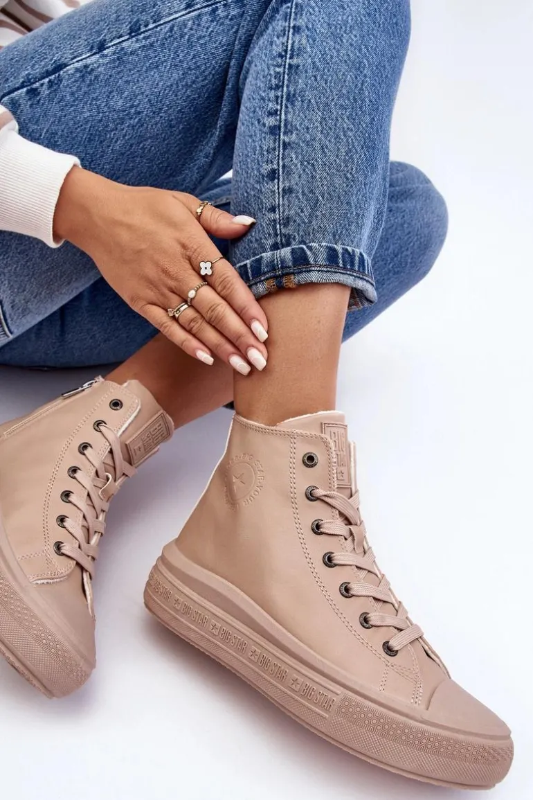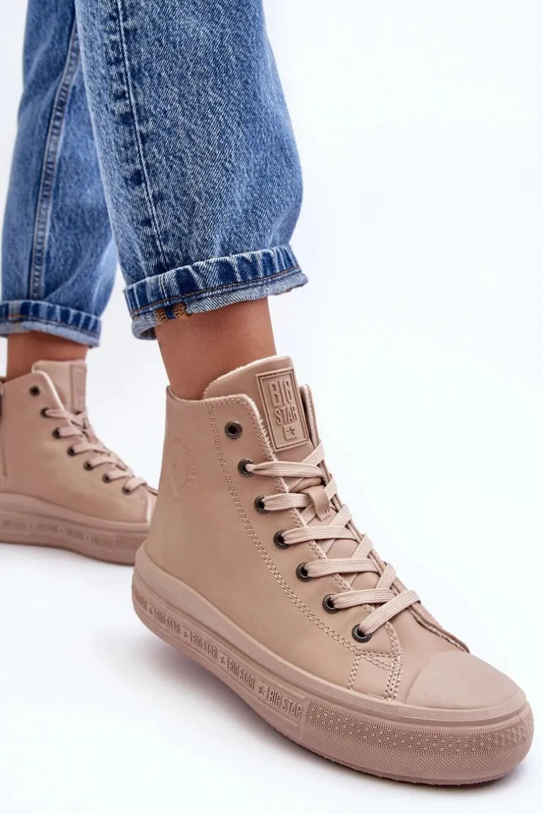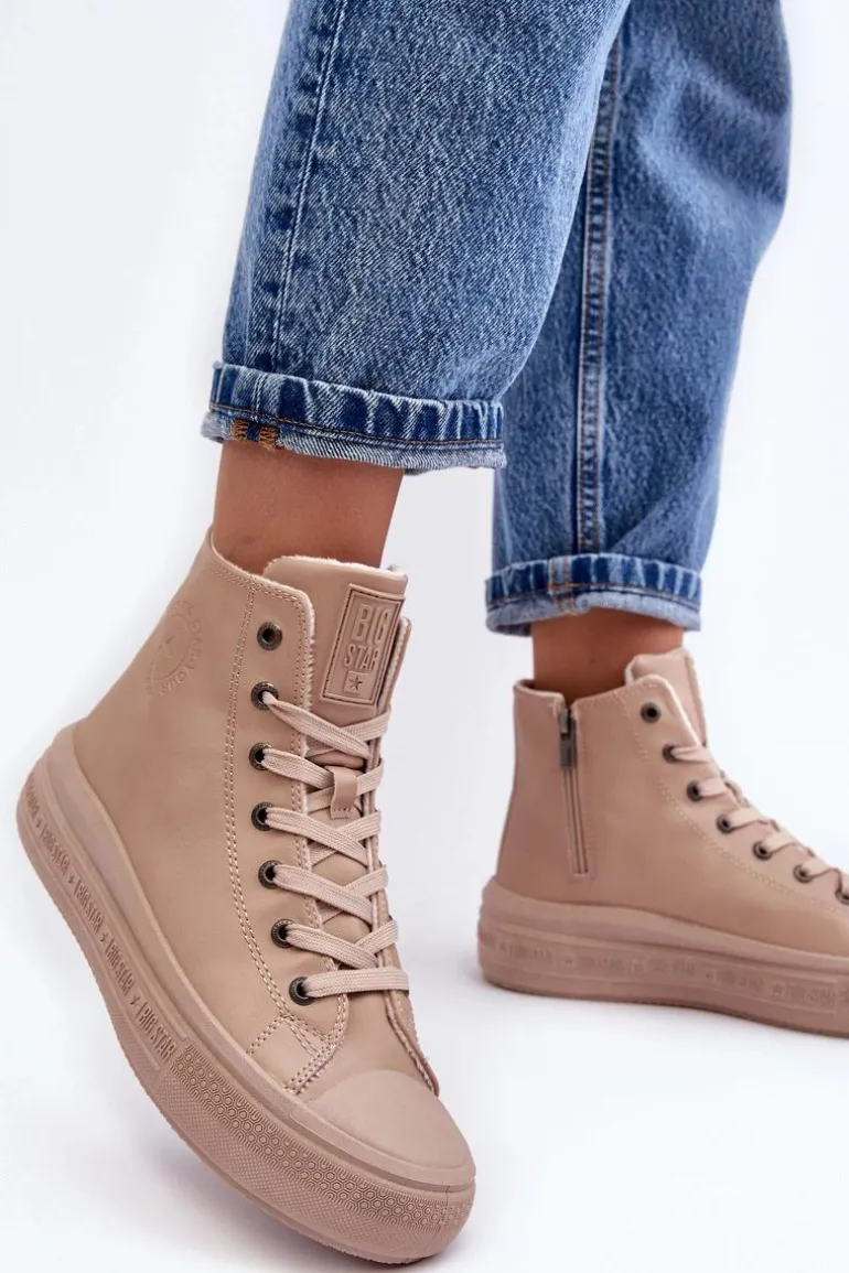 Damskie trampki od marki BIG STAR osadzone na platformie z gumowego tworzywa. Wykonane z eko skóry. Zapinane na suwak oraz dodatkowo posiadają sznurówki. Środek ocieplony futerkiem. Zapiętek jest usztywniony. Cholewka za kostkę. Koniecznie sprawdź całą naszą kolekcję butów marki BIG STAR. Przy wyborze rozmiaru prosimy sugerować się tabelą rozmiarów.