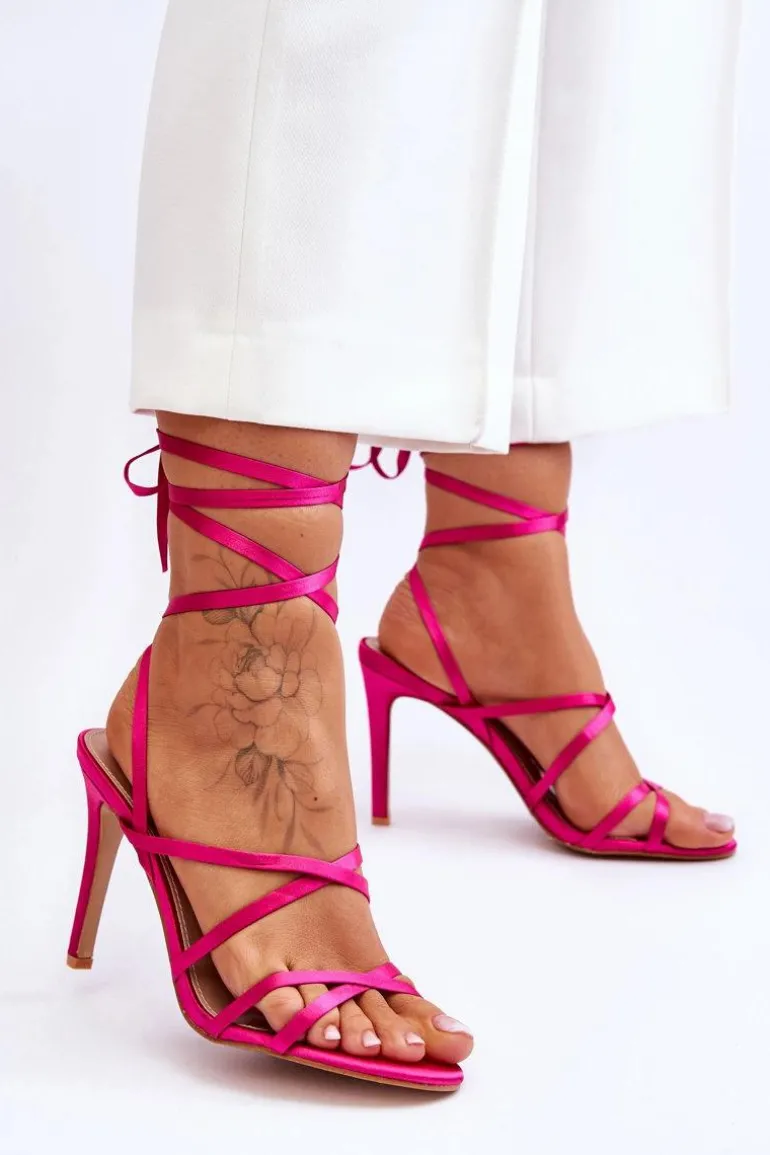 Klasyczne, damskie sandałki zostały wykonane z materiału tekstylnego. Osadzone na obcasie w postaci szpilki. Sandałki posiadają miękką, eko skórzaną wkładkę. Idealne na upalne dni, dzięki przewiewnemu fasonowi. Sandałki posiadają odkryty, lekko zaokrąglony nosek. Model ten jest wiązany wokół łydki. Przy wyborze rozmiaru prosimy sugerować się tabelą rozmiarów.