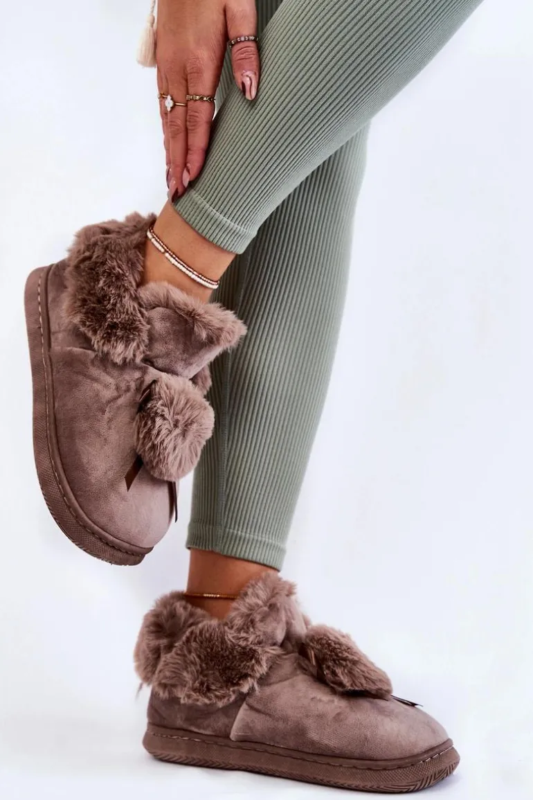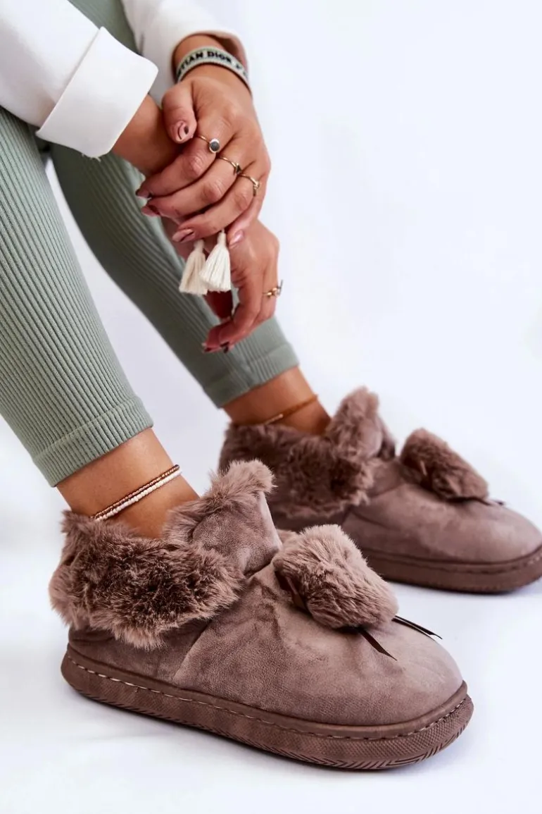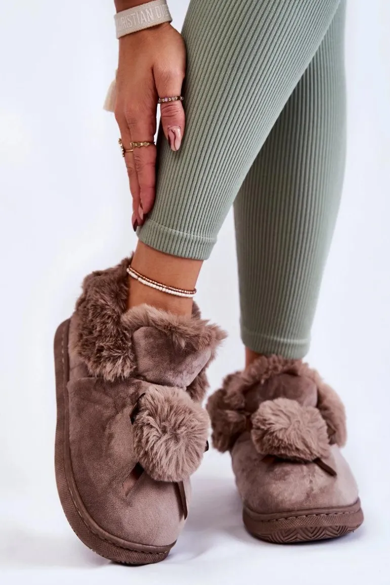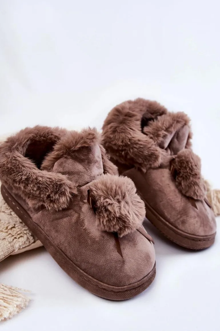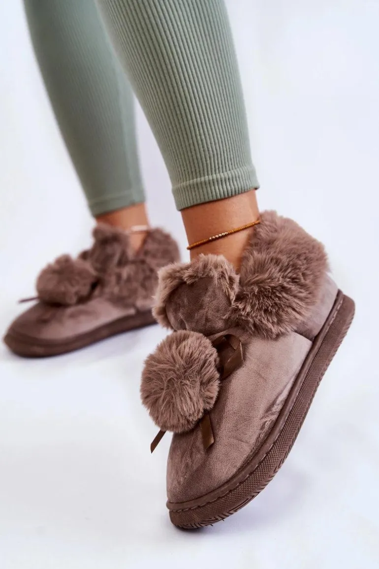 Damskie Wsuwane Futrzane Papcie Z Pomponem Brązowe Noemi