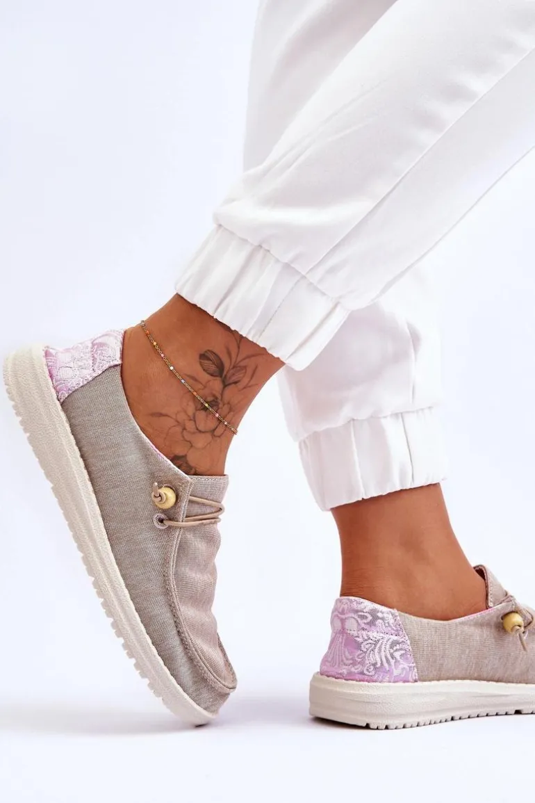 Wsuwane tenisówki damskie zostały wykonane z materiału tekstylnego z ozdobnym tyłem cholewki. Model wsuwany z gumkami imitującymi sznurowadła. Trampki zostały osadzone na delikatnej platformie z tworzywa sztucznego. Wkładka w tym obuwiu jest wykonana z pianki. Przy wyborze rozmiaru prosimy sugerować się tabelą rozmiarów.