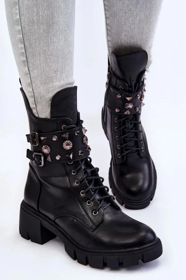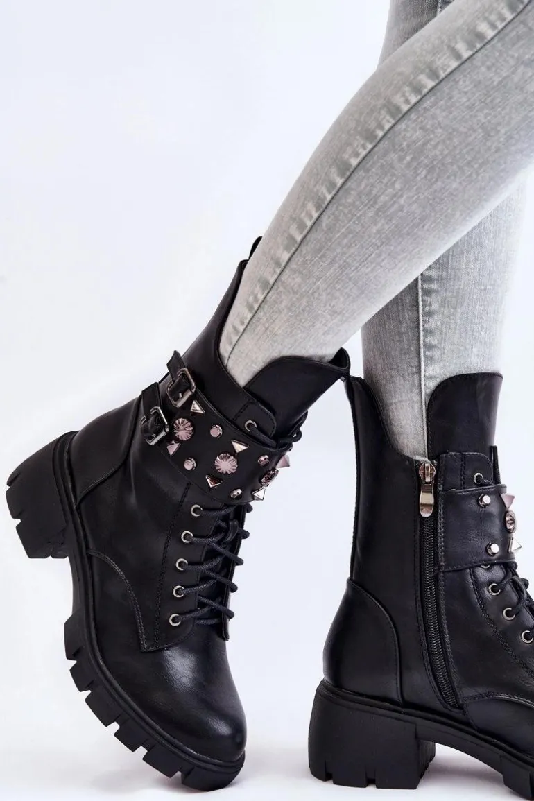 Damskie botki zostały wykonane z eko skóry. Buty zapinane na suwak oraz sznurowane. Klasyczny model został osadzony na płaskim obcasie i platformie. Botki te nie posiadają ocieplenia. Dodatkowo zostały ozdobione ćwiekami na pasku z klamrami. Zapiętek jest usztywniany. Koniecznie powinnaś je mieć w swojej szafie! Przy wyborze rozmiaru prosimy sugerować się tabelą rozmiarów.