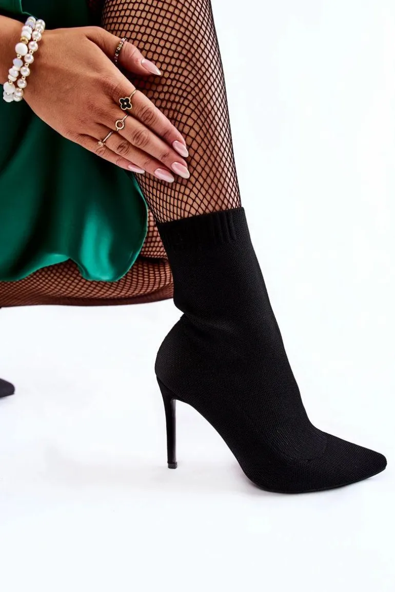 Botki posiadają modną, skarpetkową cholewkę za kostkę. Osadzone na obcasie typu szpilka. Nosek w szpic świetnie wysmukli stopę. Model wsuwany. Wykonane z elastycznego materiału, który idealnie dopasuje się do nogi. Wkładka z eko skóry. Buty posiadają usztywniany zapiętek. Idealne buty do jeansów czy dłuższych, koszulowych sukienek.Przy wyborze rozmiaru prosimy sugerować się tabelą rozmiarów.