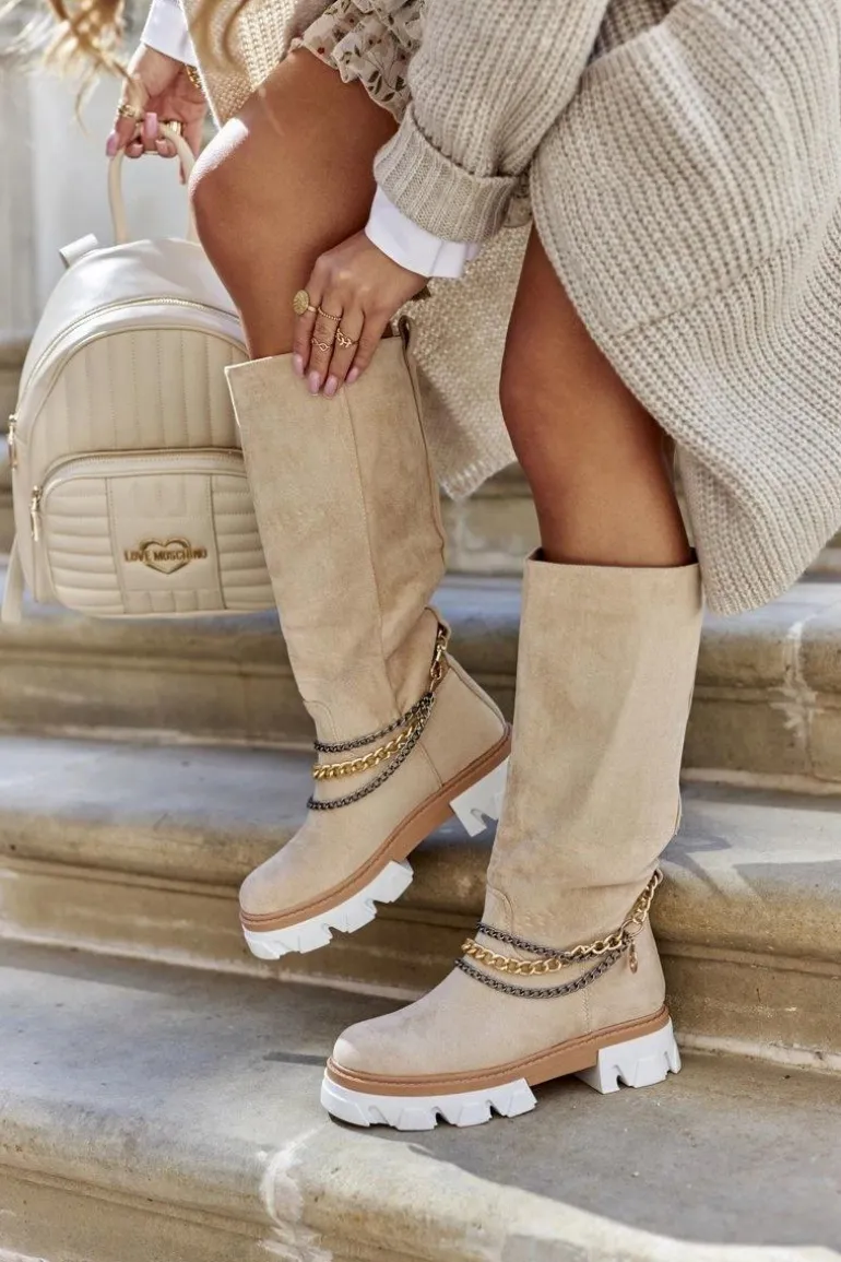Kozaki do kolana wykonane z zamszowej skóry ekologicznej. Wnętrze ocieplane kocem obuwniczym. Gruba, antypoślizgowa podeszwa zapewnia bezpieczeństwo na każdej nawierzchni oraz dodatkowo izoluje przed zimnem. Przy wyborze rozmiarów prosimy sugerować się tabelą rozmiarów.