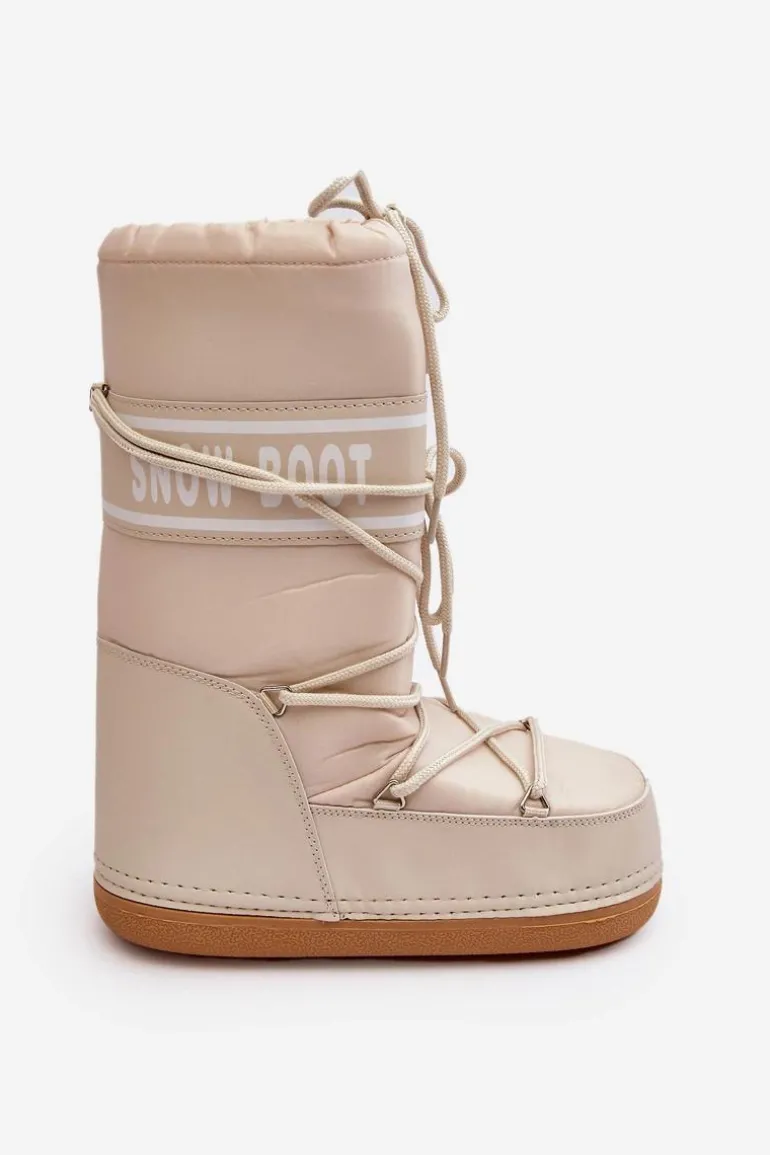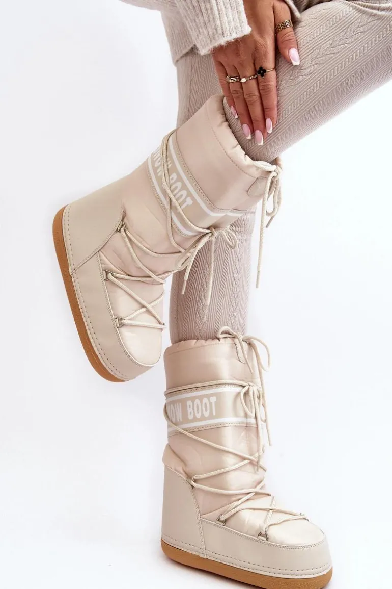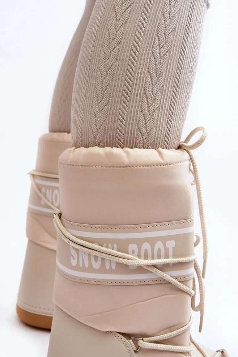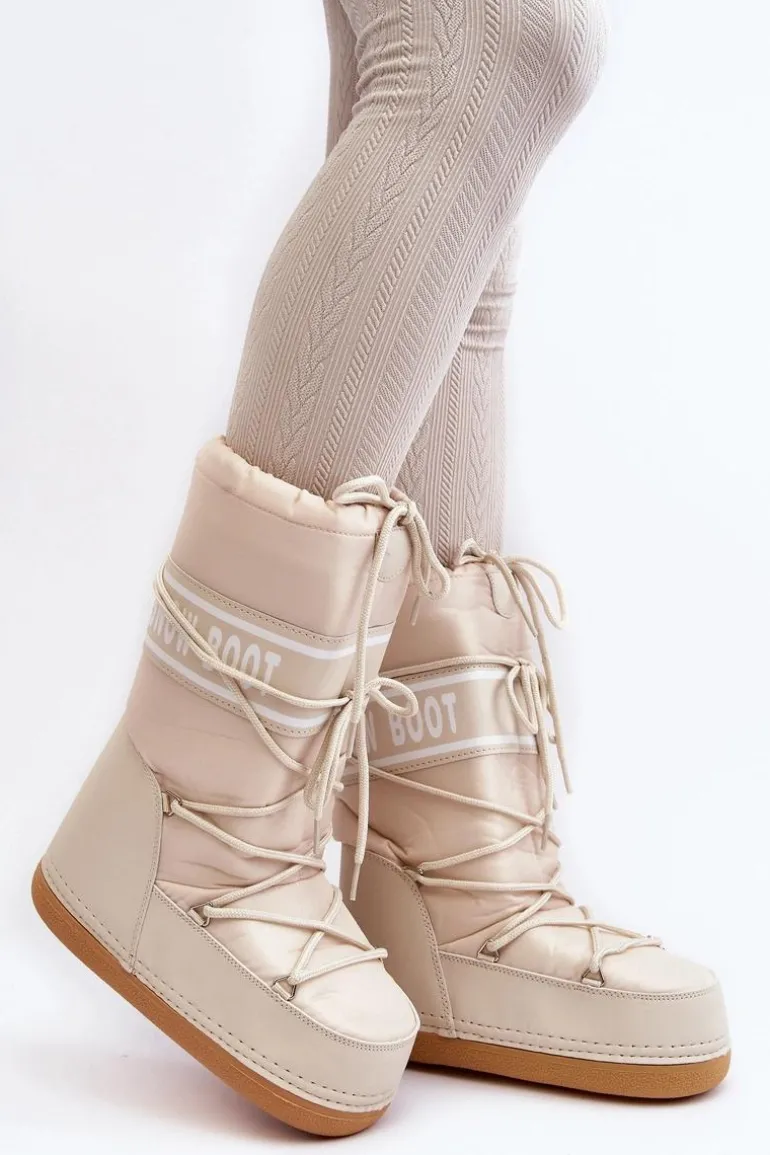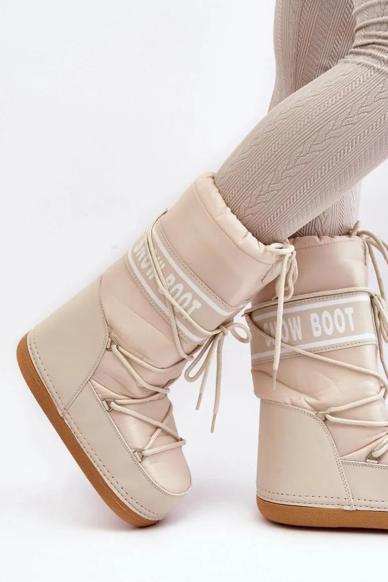 Niezwykle ciepłe i wygodne, damskie śniegowce zostały wykonane z materiałów odpornych na zimno i wiatr. Cholewka z dodatkiem eko skóry i ozdobnym napisem wzbogaci Twoją jesienno-zimową stylizację. Śniegowce są wsuwane i posiadają dodatkowe sznurowanie z przodu i u góry cholewki. Model ten został osadzony na masywnej platformie. Wewnątrz posiadają ocieplenie w postaci pianki i koca obuwniczego. Te śniegowce to idealny model na chłodniejsze dni! Przy wyborze rozmiaru prosimy sugerować się tabelą rozmiarów.