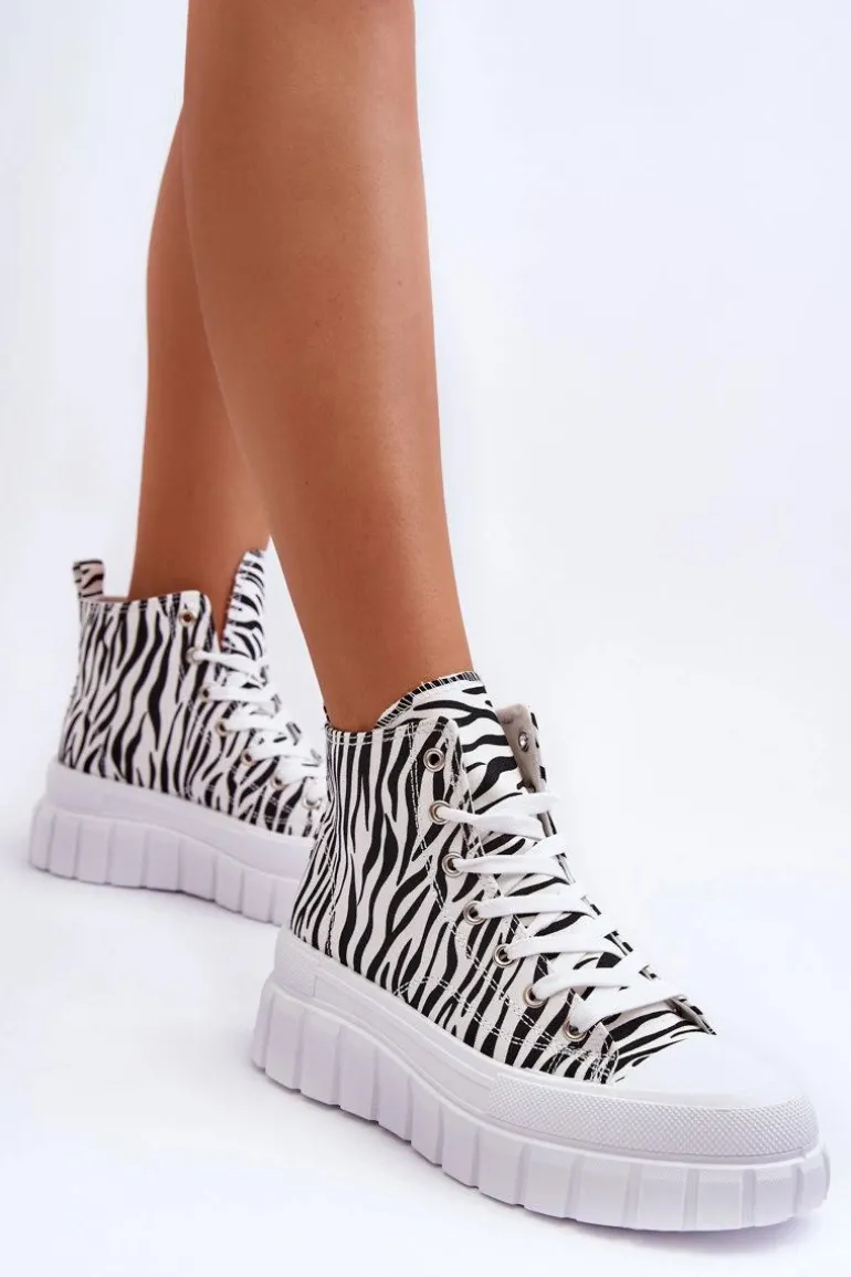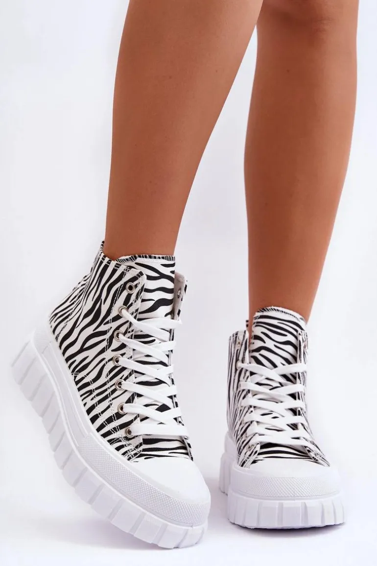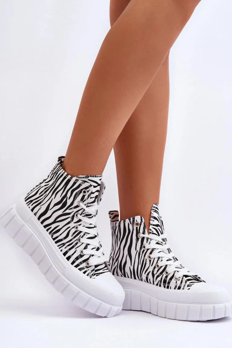 Stylowe, wysokie trampki damskie zostały wykonane z materiału tekstylnego. Model ten jest klasycznie sznurowany i ozdobiony zwierzęcym wzorem. Buty zostały osadzone na masywnej, gumowej platformie. Z pewnością zakochasz się w tym modelu! Przy wyborze rozmiaru prosimy sugerować się tabelą rozmiarów.