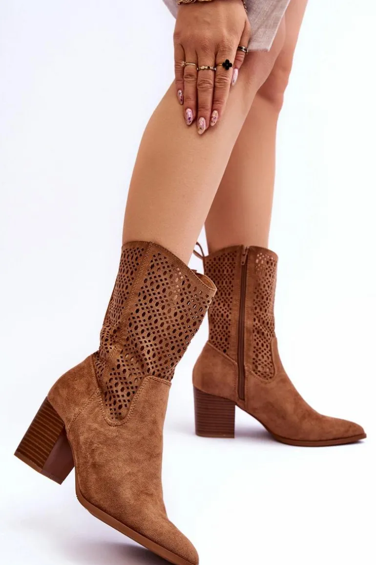 Modne botki-kowbojki z wyższą cholewką. Wykonane zostały z ekologicznego zamszu z modnym, ażurowym wzorem. Materiałowa wkładka oraz usztywniany zapiętek zadbają o Twój komfort. Posiadają masywny obcas w postaci słupka. Idealnie sprawdzą się zarówno do sukienek, jak i jeansów. Przy wyborze rozmiaru prosimy sugerować się tabelą rozmiarów.