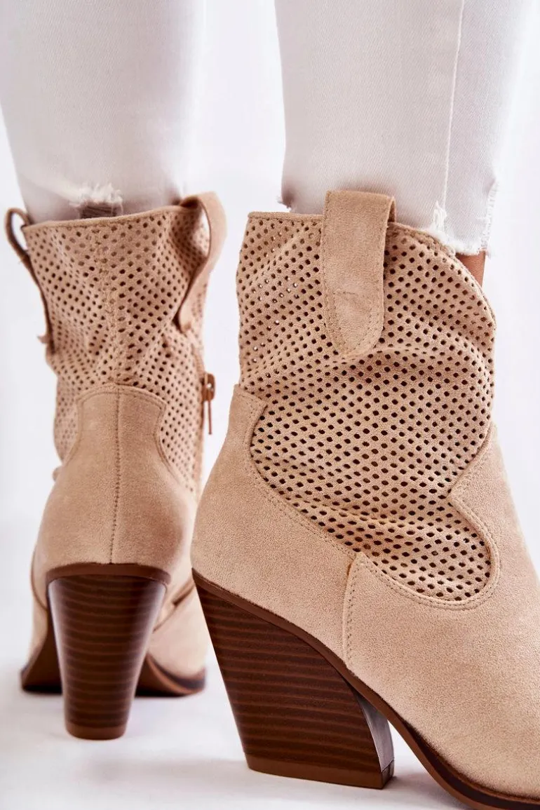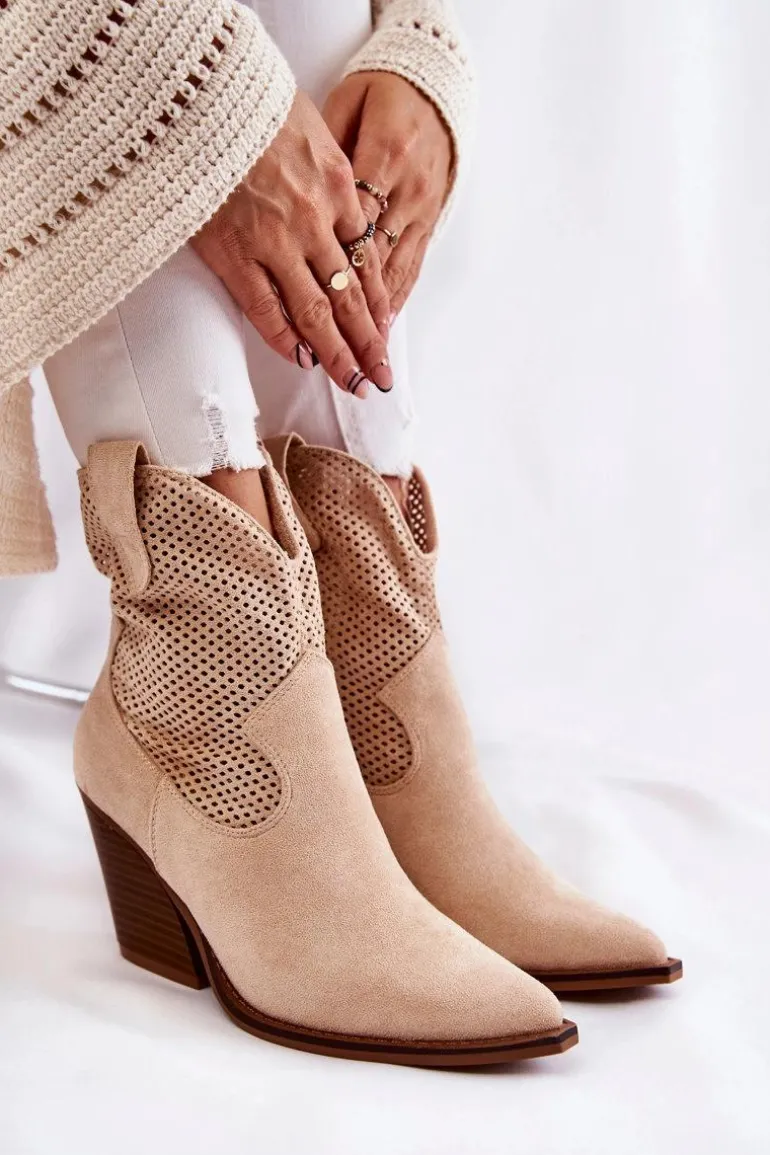 Świetne botki damskie wykonane z eko zamszu w ażurowy wzór. Posiadają usztywniany zapiętek oraz nosek w szpic charakterystyczny dla fasonu kowbojek. Model wsuwany z dodatkowym suwakiem z boku cholewki. Osadzone na masywnym obcasie w postaci ściętego słupka. Botki te to idealny model na sezon przejściowy. Świetnie będą prezentować się w wielu stylizacjach. Przy wyborze rozmiaru prosimy sugerować się tabelą rozmiarów.