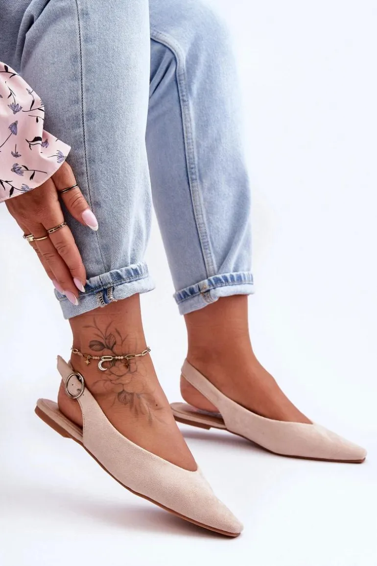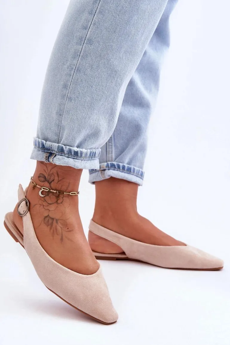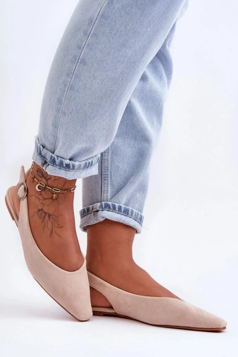 Wyjątkowe baleriny damskie posiadają odkrytą piętę i charakterystyczny, wydłużony nosek. Zostały wykonane z eko zamszu. Posiadają regulowany pasek zapinany na sprzączkę. Wkładka z eko skóry zapewni komfort podczas użytkowania. Baleriny posiadają płaski obcas oraz antypoślizgową podeszwę. Podczas wyboru rozmiaru prosimy sugerować się tabelą rozmiarów.