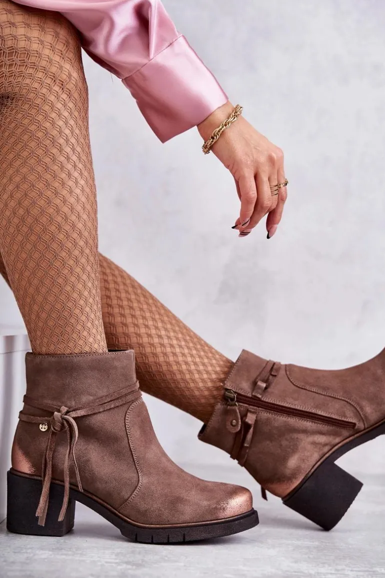 Botki damskie marki Maciejka zostały wykonane z najwyższej jakości skór. Posiadają ozdobny paseczek na boku cholewki zawiązany na supełek. Zapinane na suwak. Model z przetarciami z przodu i z tyłu. Botki osadzono na obcasie w postaci masywnego słupka. Środek został ocieplony kocem obuwniczym. Miękka wkładka zapewni komfort podczas użytkowania. Przy wyborze rozmiaru prosimy sugerować się tabelą rozmiarów.