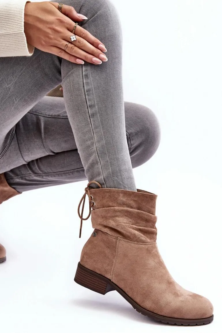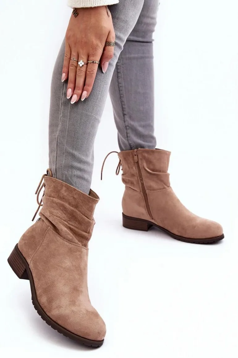 Damskie botki wykonane z eko zamszu. Osadzone na płaskim obcasie. Zapinane na suwak z boku cholewki. Z tyłu ozdobne wiązanie. Noski zaokrąglone. Środek ocieplony kocem obuwniczym. Świetny model do wielu stylizacji! Przy wyborze rozmiaru prosimy sugerować się tabelą rozmiarów.